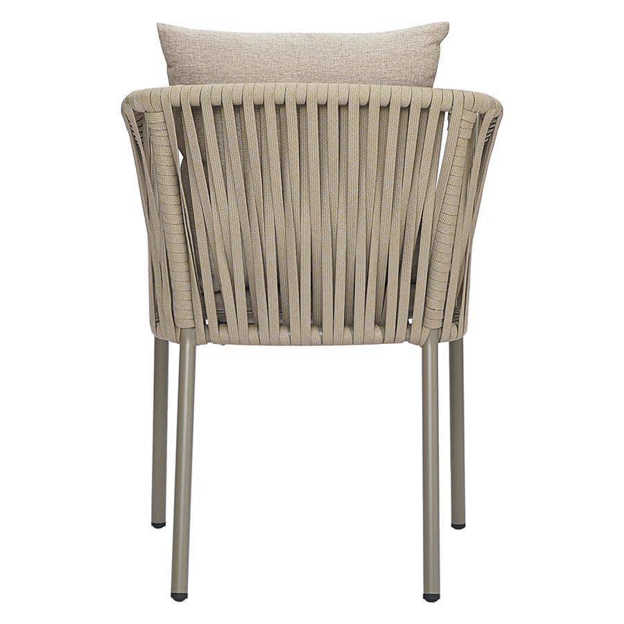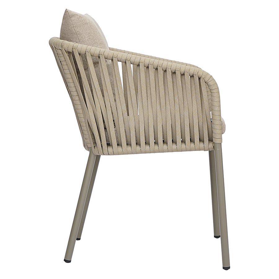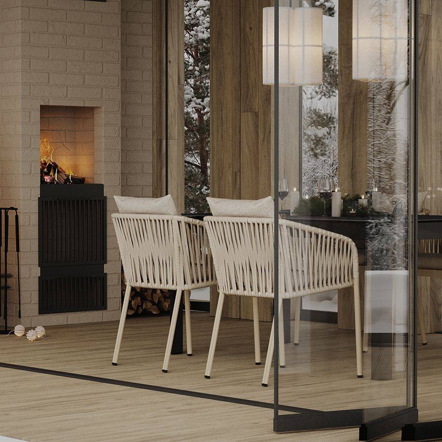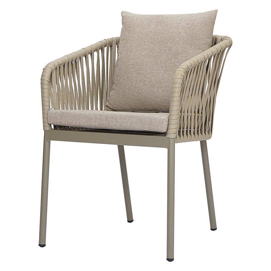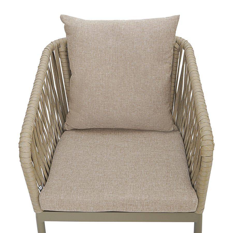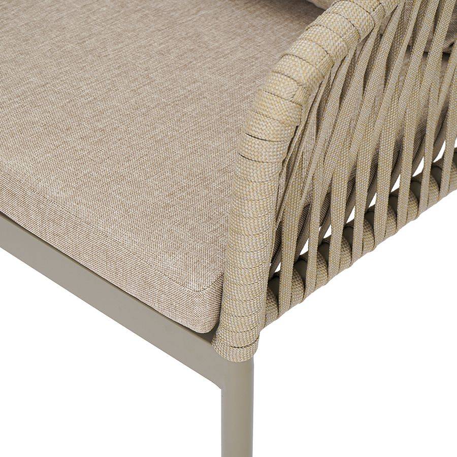 Благодаря надежному основанию из алюминия этот стул прослужит вам долгие годы, сохранив привлекательный вид и первоначальные характеристики. Материал прочный, не подвержен коррозии. Высокая спинка, плавно переходящая в подлокотники, обеспечивает удобство при сидении и делает дизайн интересным. В комплект входят подушки с чехлами из полиэстера и мягким наполнителем из пенополиуретана толщиной 5 см, которые создают дополнительный комфорт. Ткань обладает влагоотталкивающими свойствами, устойчива к ультрафиолету. Декоративные элементы, напоминающие ротанговое плетение, смягчают строгие формы каркаса и придают модели необычный вид. Специальные пластиковые накладки на ножках защищают напольное покрытие от царапин.