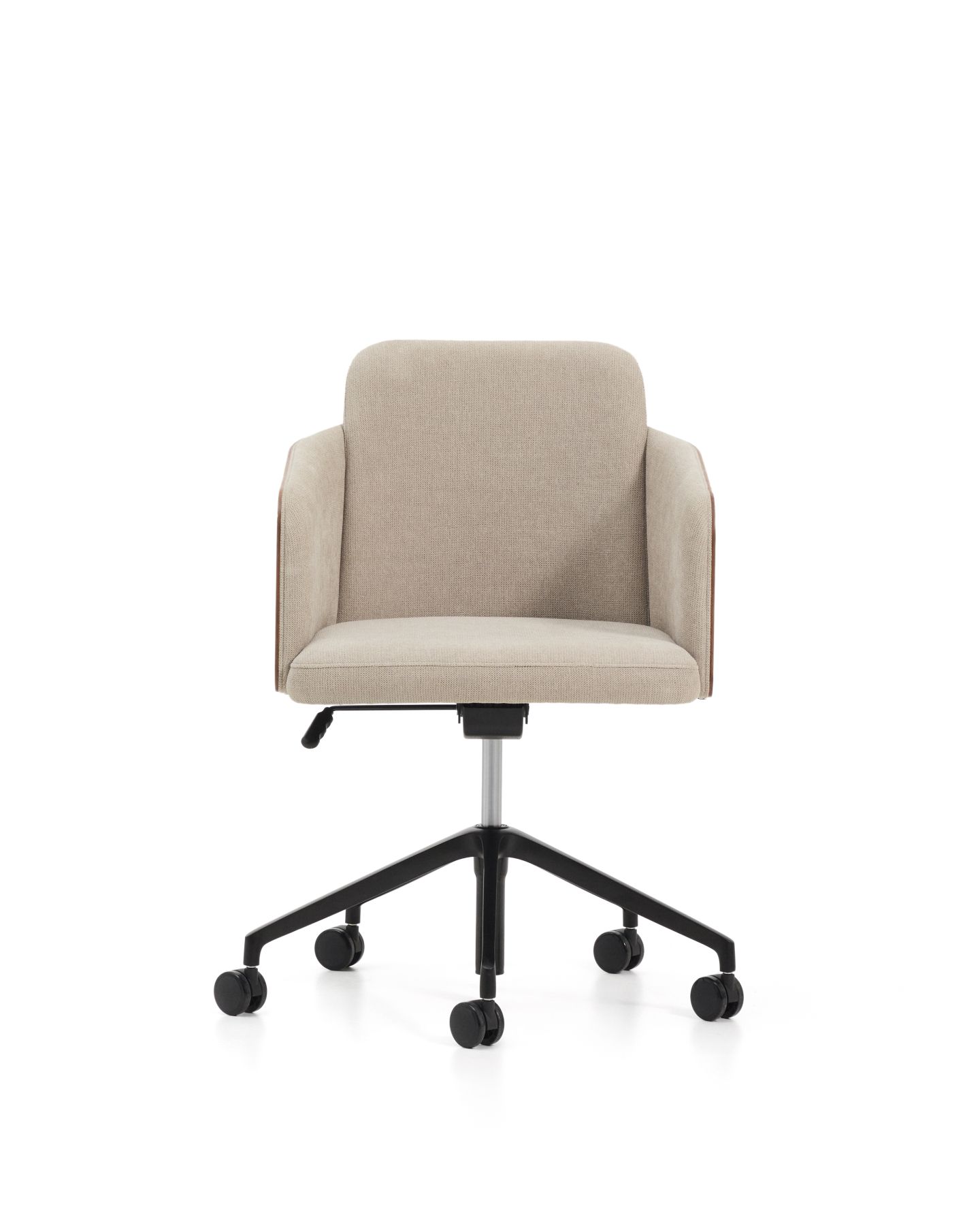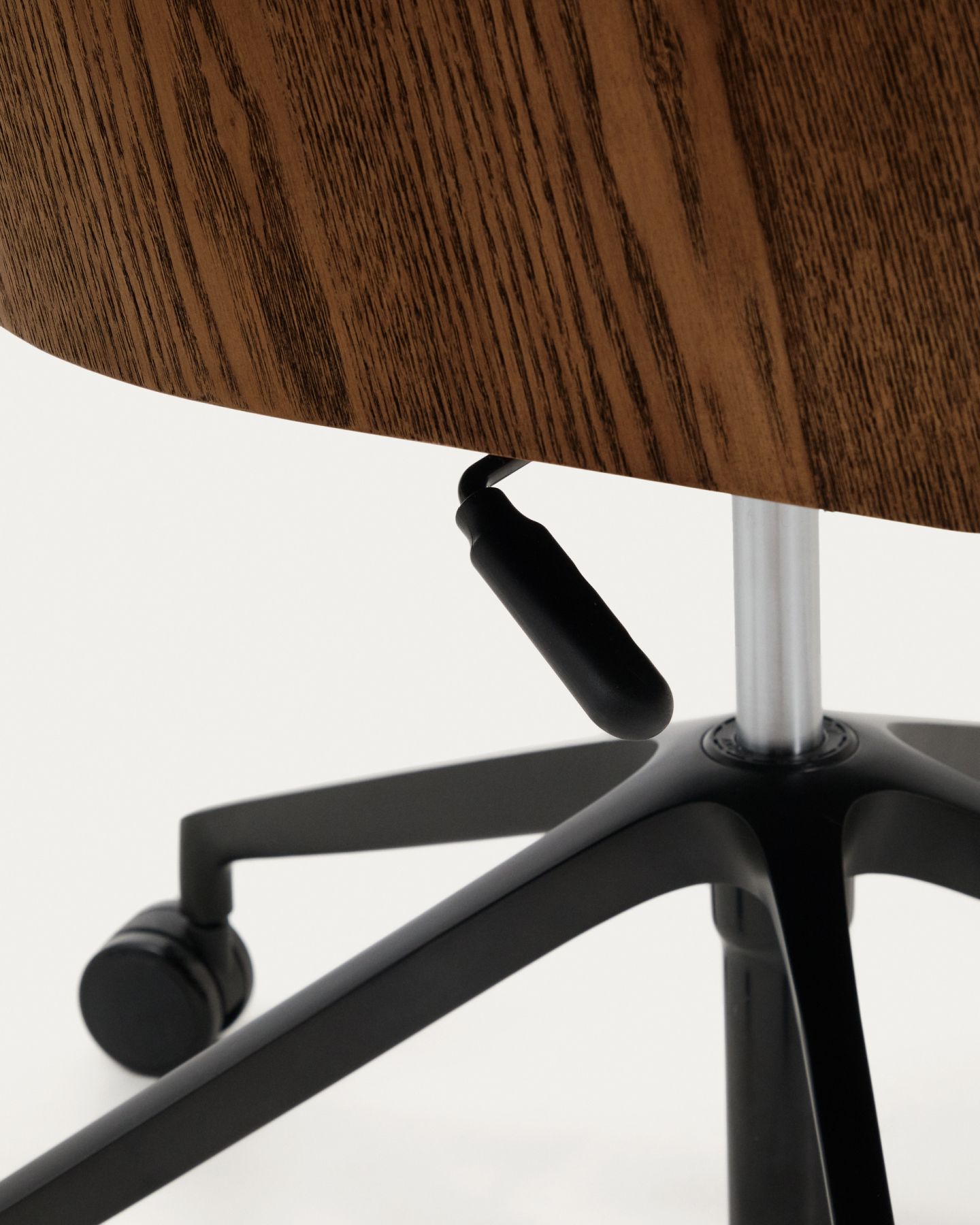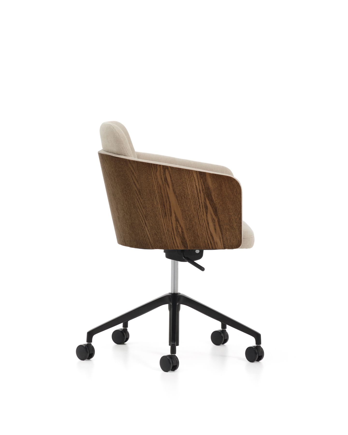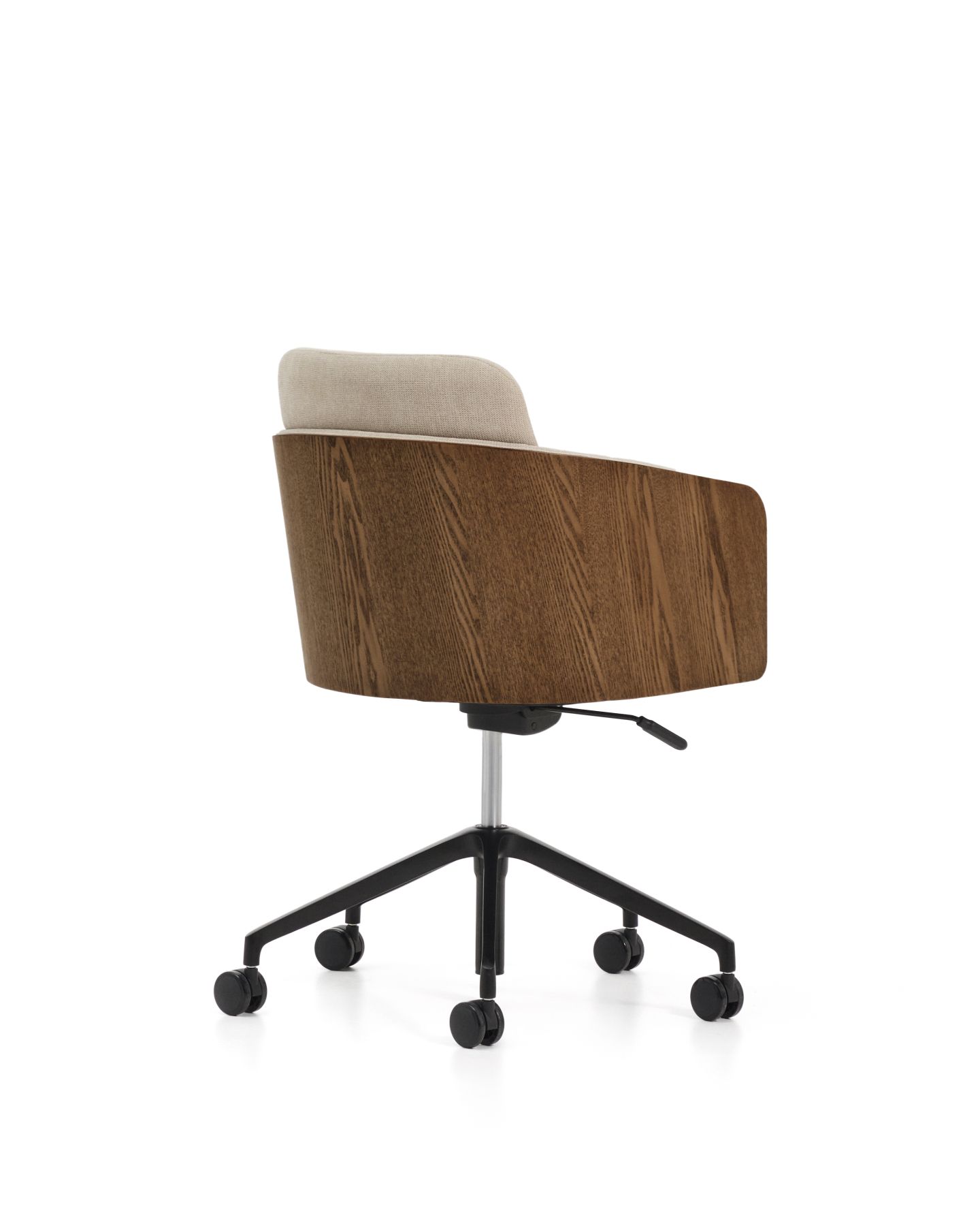 Рабочий стул Madai из ясеневого шпона с обивкой из шенилла сочетает в себе дизайн и комфорт в изделии, предназначенном для повседневного использования. Ясеневый шпон сертифицирован FSC Mix Credit и изготовлен из смеси материалов, полученных из сертифицированных FSC лесов и контролируемой FSC древесины. Основание и ножки из матового чёрного алюминия покрыты термореактивным лаком, устойчивым к царапинам. Полиуретановые колёса защищают пол от царапин и оснащены системой амортизации, обеспечивающей устойчивость и управляемость во время катания.