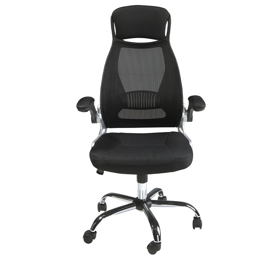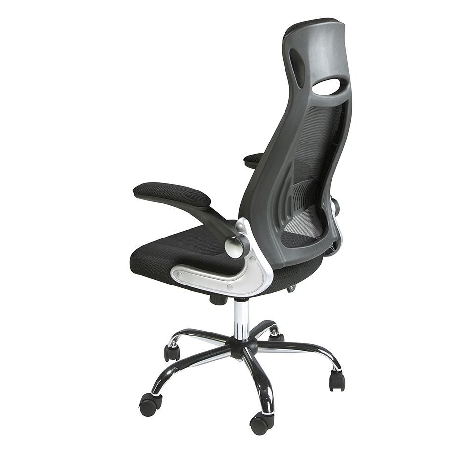 Поворотное офисное кресло с современным дизайном с сиденьем и спинкой, обитыми черной тканью. У него есть подлокотники, что делает его более удобным. Благодаря ножкам из хромированной нержавеющей стали и регулируемому по высоте сидению он станет важным для вашей рабочей зоны, не оставляя в стороне самый авангардный стиль. Его ролики обеспечат дополнительную практичность, необходимую для работы или учебы.