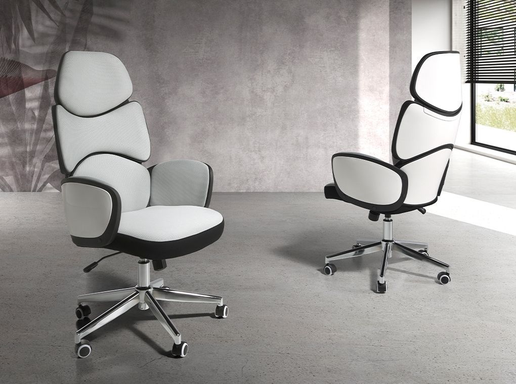 Поворотный офисный стул с современным дизайном с сиденьем, обитым из светло-серой ткани, и спинкой из белого глянцевого ПВХ. У него есть подлокотники, что делает его более удобным. Благодаря ножкам из хромированной нержавеющей стали и регулируемому по высоте сидению он станет важным для вашей рабочей зоны, не оставляя в стороне самый авангардный стиль. Его ролики обеспечат дополнительную практичность, необходимую для работы или учебы.