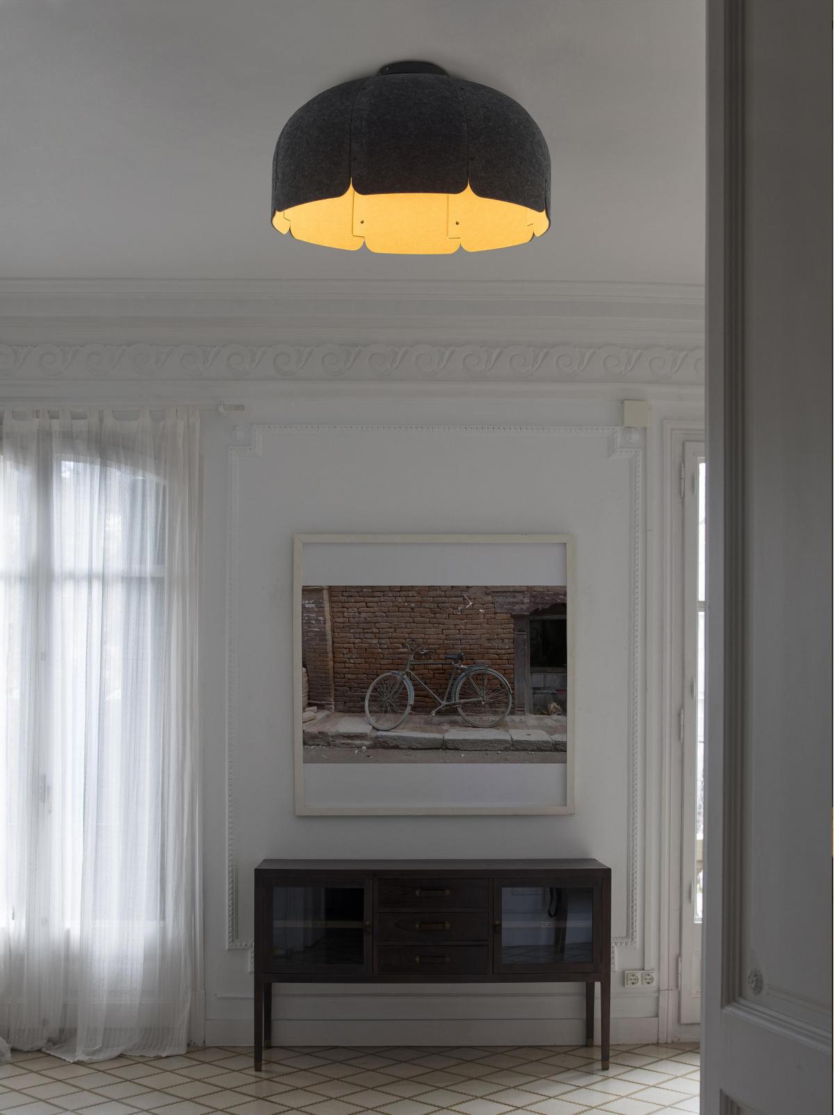 MUTE - дизайнерская подвесная лампа, созданная Nahtrang. Дисплей в коричнево-темно-серой версии уменьшает звуковую память, что делает его идеальным для освещения ресторанов или шумных помещений . Он состоит из 8 листов листов, и каждый лист состоит из 2 слоев акустического материала. Он изготовлен из переработанных бутылок на 65-70% и не содержащих ПЭТ волокон на 30-35%. Это версия с регулируемой яркостью, интенсивность света можно регулировать .