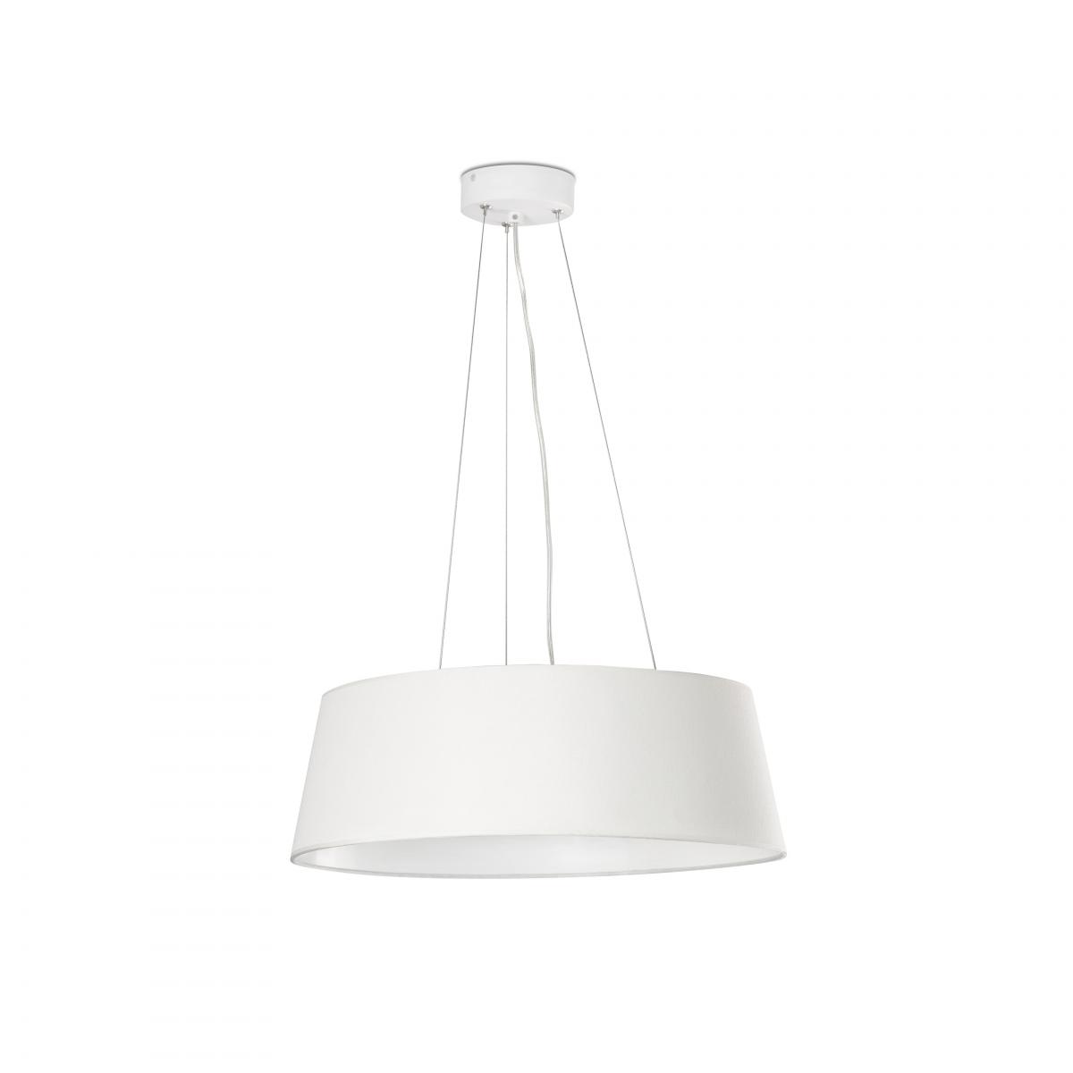 "Подвесной светодиодный светильник с текстильным плафоном и диффузором из поликарбоната. Его стиль дает комнате прозрачное равномерное освещение, идеально подходящее для столовых. Источником света является встроенный теплый свет SMD LED 40W."