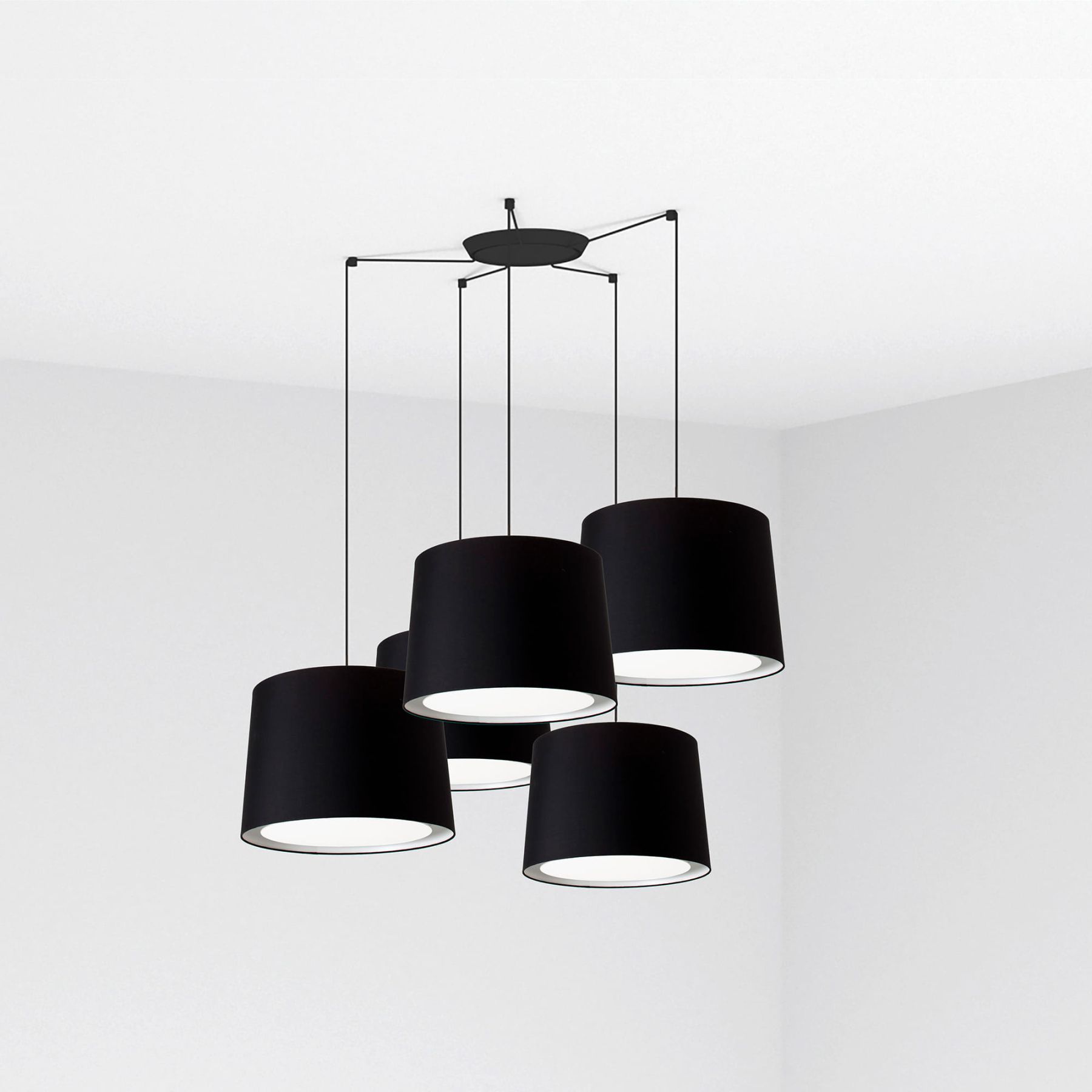 Версия с 5 лампами. CONGA — это коллекция ламп для внутреннего освещения, разработанная Faro Lab. Этот черный подвесной светильник с черным текстильным абажуром предназначен для освещения спален и гостиных. Это хороший выбор для отелей.