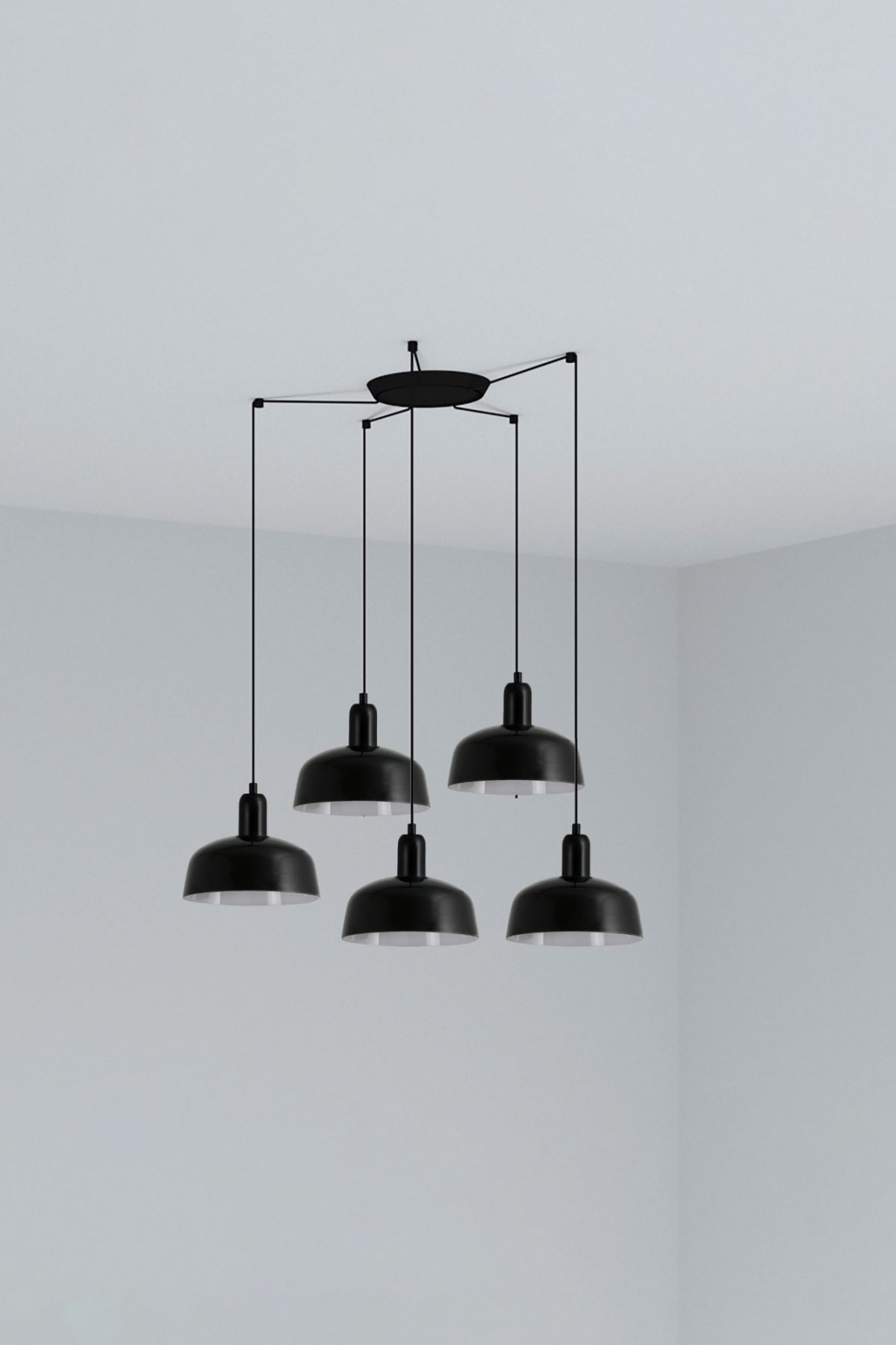 TATAWIN S — это семейство светильников, разработанное Адольфо Абейоном. Форма тени напоминает верхнюю часть характерных домов Татауина, города на юго-востоке Туниса. Он идеален для создания композиций из одной точки света как в контрактных помещениях, так и дома. Версия с абажуром из черного глянцевого стекла и несколькими потолочными розетками с 5 светильниками.
