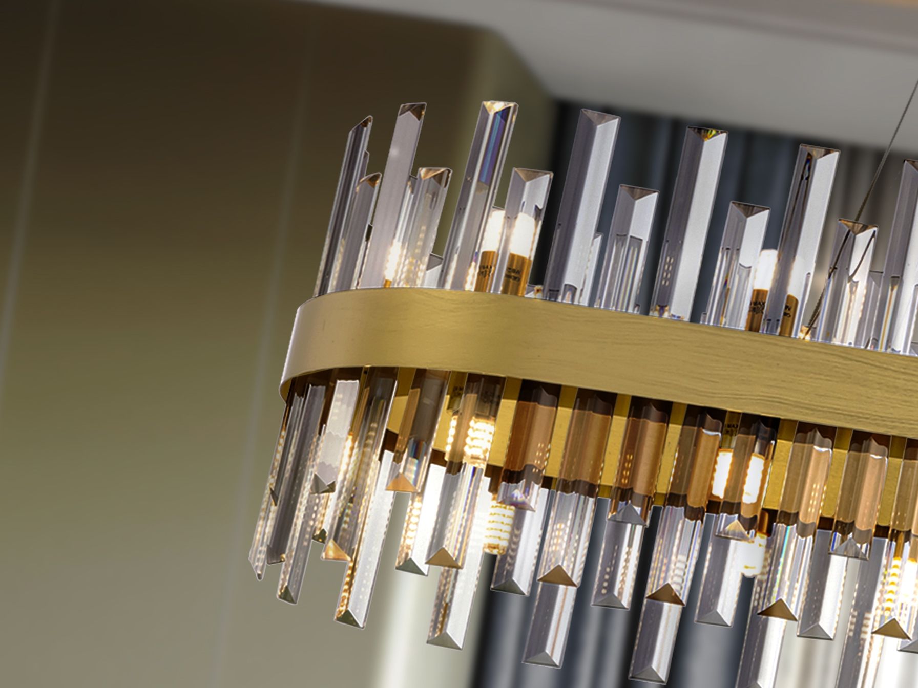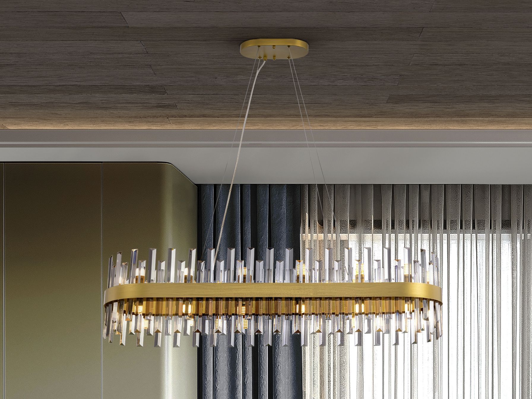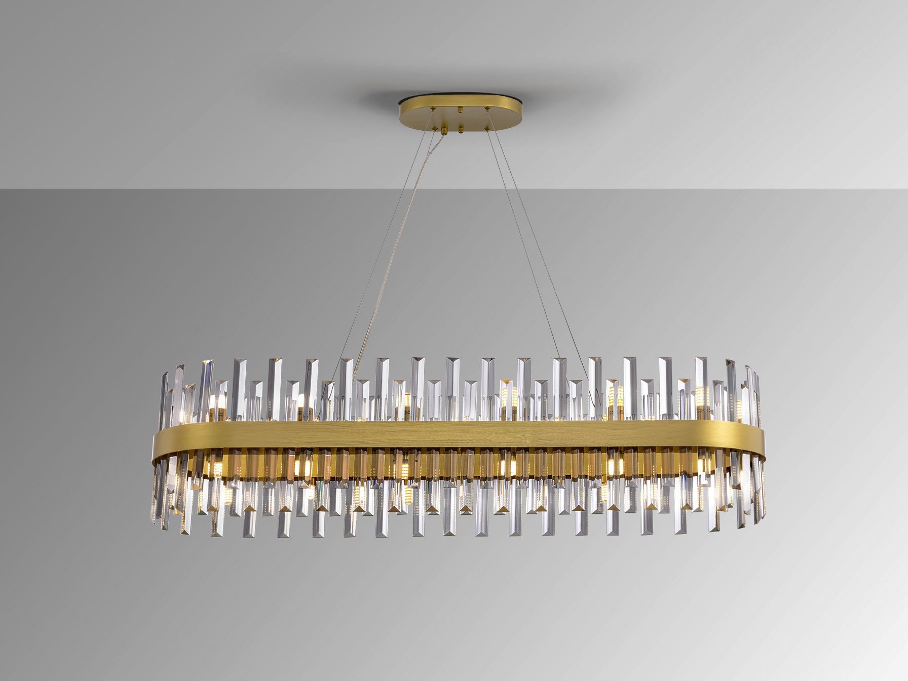 Овальная люстра на 28 ламп из матового металла с золотым покрытием. Рассеиватель из прозрачных стеклянных прутков призматической формы.