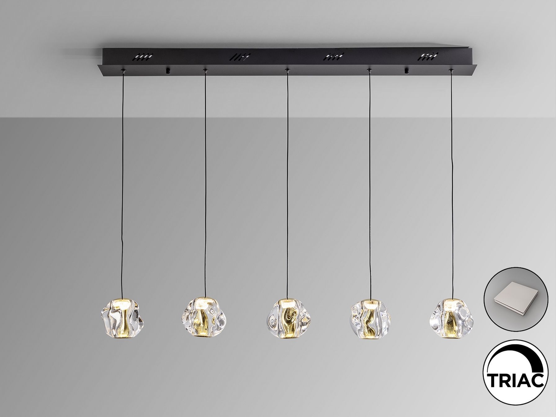Лампа на 5 ламп, выполнена из металла с матово-черным покрытием с золотистыми деталями и прозрачными акриловыми плафонами. Светодиод 21 Вт, 1339 лм, 3000 К. В комплект входит драйвер TRIAC и НАБОР ДЛЯ ДИММИРОВАНИЯ.