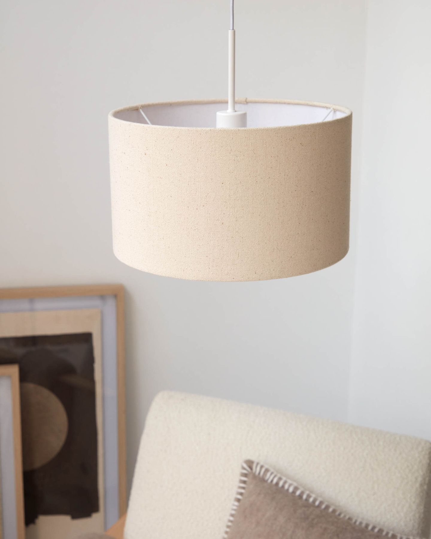 • Льняной абажур для потолочного светильника с бежевой отделкой. Лампочка, крепления и кабели в комплект не входят, требуется доукомплектация.