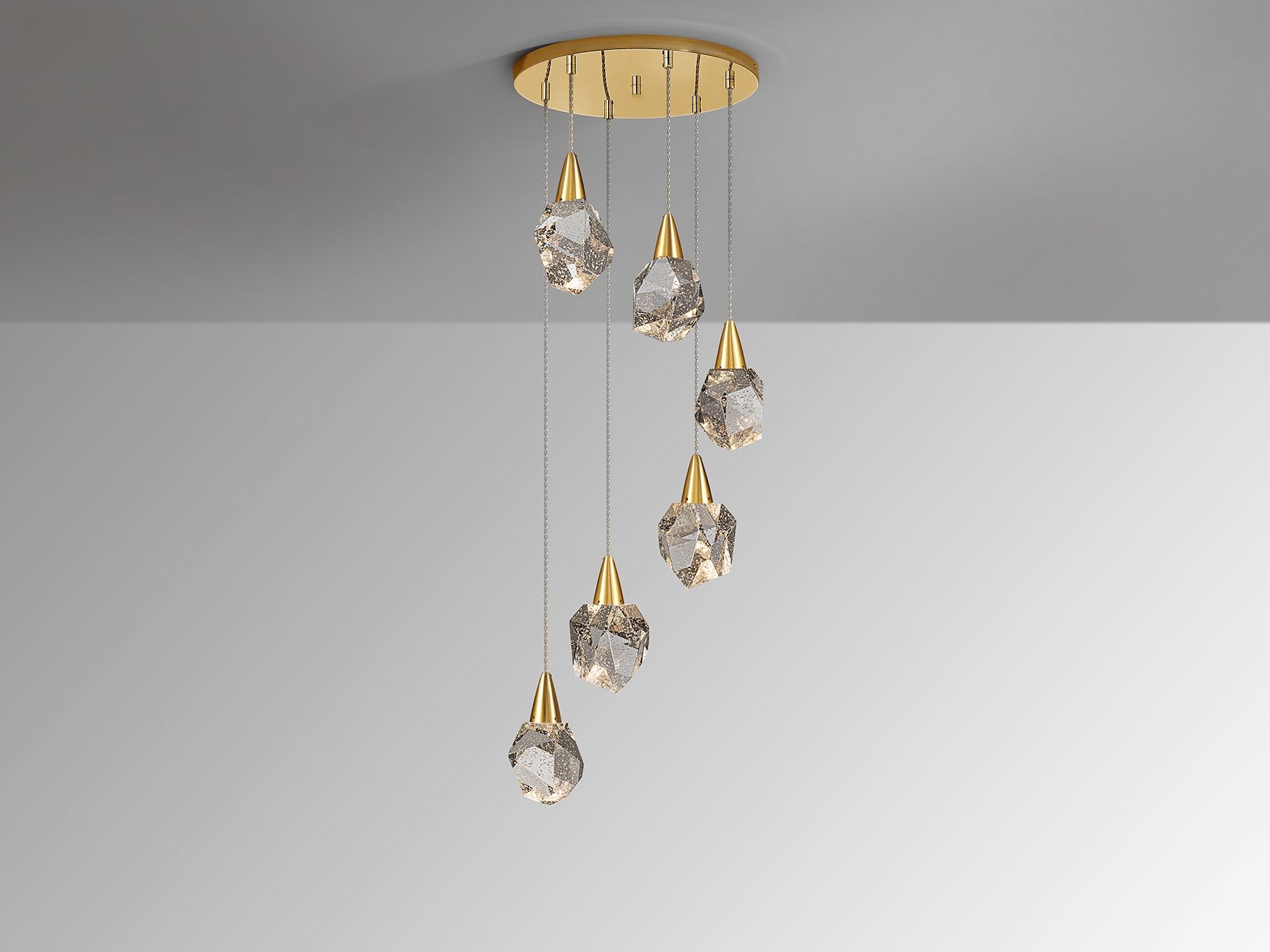Люстра из 6 светодиодов, изготовлена из металла, матовое золотое покрытие. Многогранные плафоны из цельного стекла с декоративными пузырьками внутри. Регулируется по высоте. Светодиод 24Вт. 2700 лм. 3000 К.