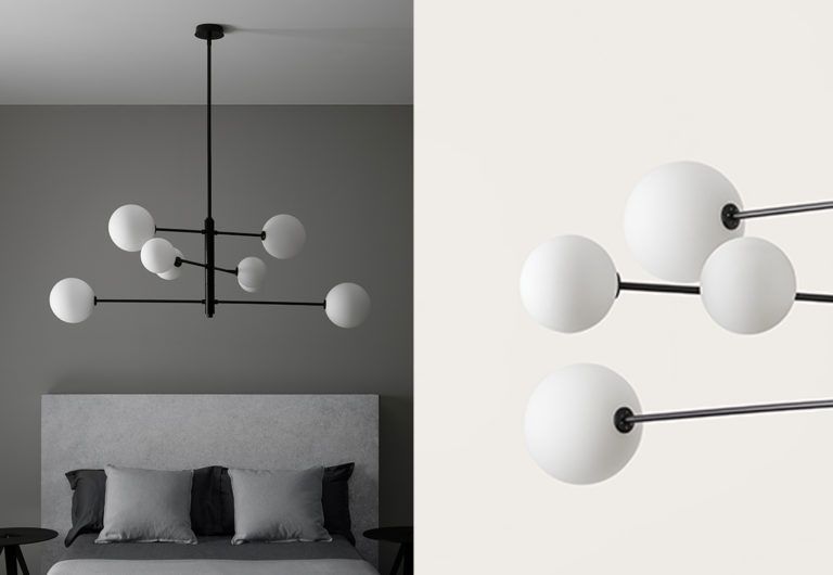 Подвесной светильник из матовой латуни или черной стали с абажурами из непрозрачных или прозрачных стеклянных шариков. Светильники можно перемещать парами, чтобы вы могли решить, какое положение вам больше нравится.