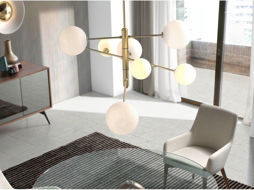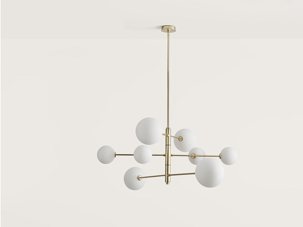 Подвесной светильник из матовой латуни или черной стали с абажурами из непрозрачных или прозрачных стеклянных шариков. Светильники можно перемещать парами, чтобы вы могли решить, какое положение вам больше нравится.
