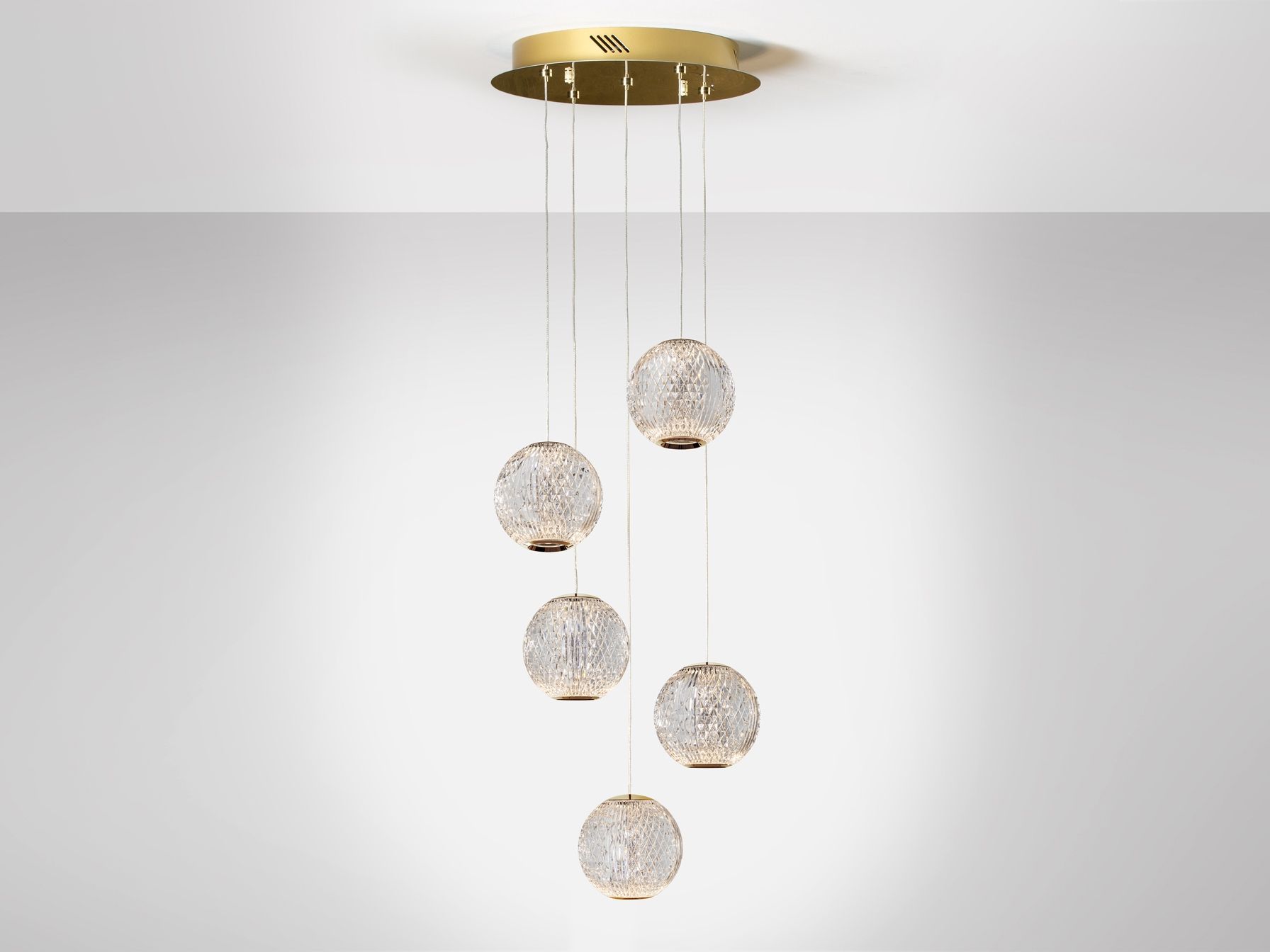 Круглый светильник с 5 светодиодами, металл с золотым покрытием. Сферические абажуры Ø11 см из прозрачного оптического акрила, имитация хрусталя. Круглый светильник с 5 светодиодами, металл с золотым покрытием. Сферические абажуры Ø11 см из прозрачного оптического акрила, имитация хрусталя. 26Вт. 3200K, 1264 лм.