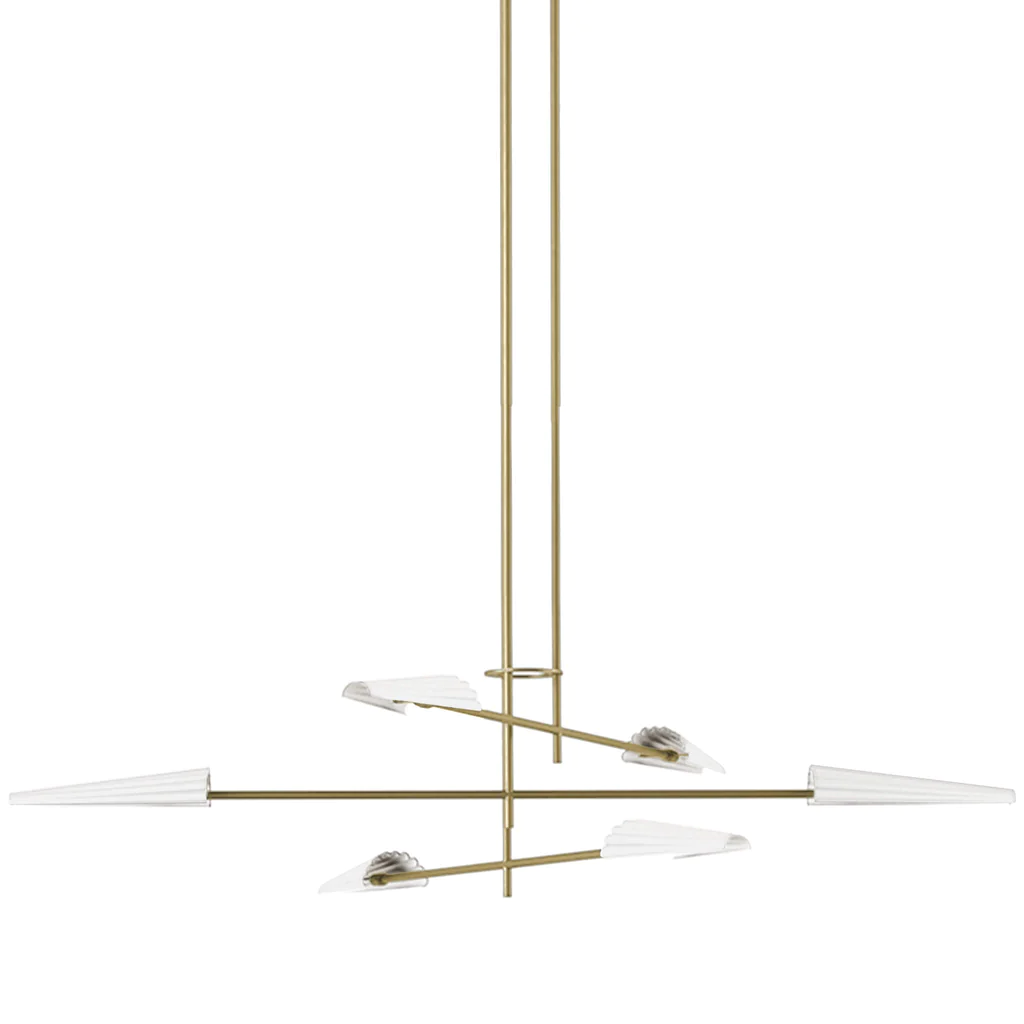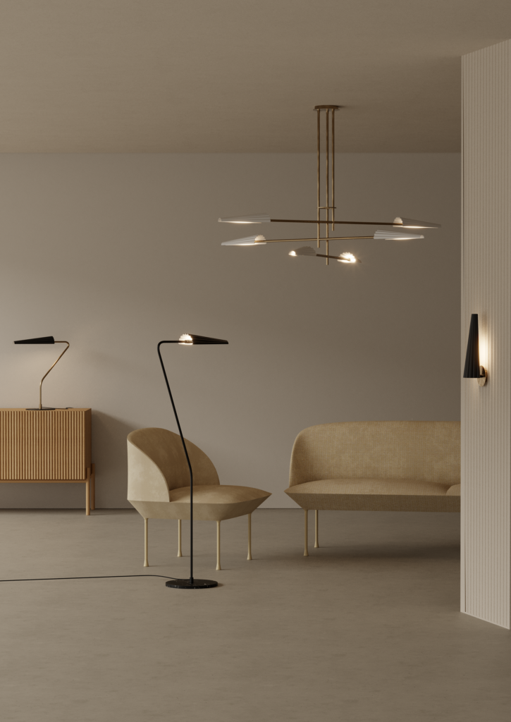 Люстра, выполненная из металла с основанием в черной или золотой отделке и абажурами черного или белого цвета.