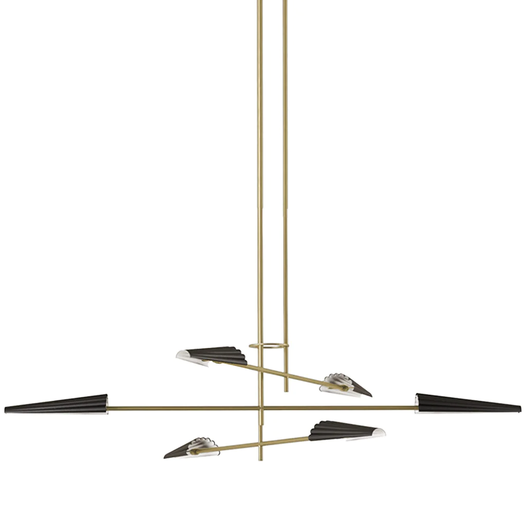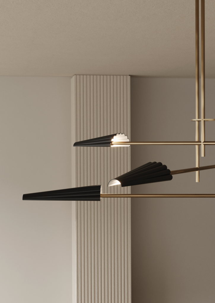 Люстра, выполненная из металла с основанием в черной или золотой отделке и абажурами черного или белого цвета.