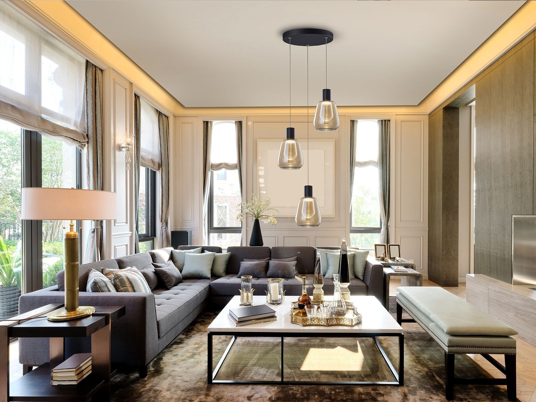 Лампа с 3 лампами, металлическая, матово-черная. Двойной абажур, снаружи из янтарного стекла, а внутренний рассеиватель из прозрачного поликарбоната с расположенными в шахматном порядке полосками. Регулируется по высоте. СВЕТОДИОД МОЩНОСТЬЮ 15 Вт, 1,050 лм, 3,000 К