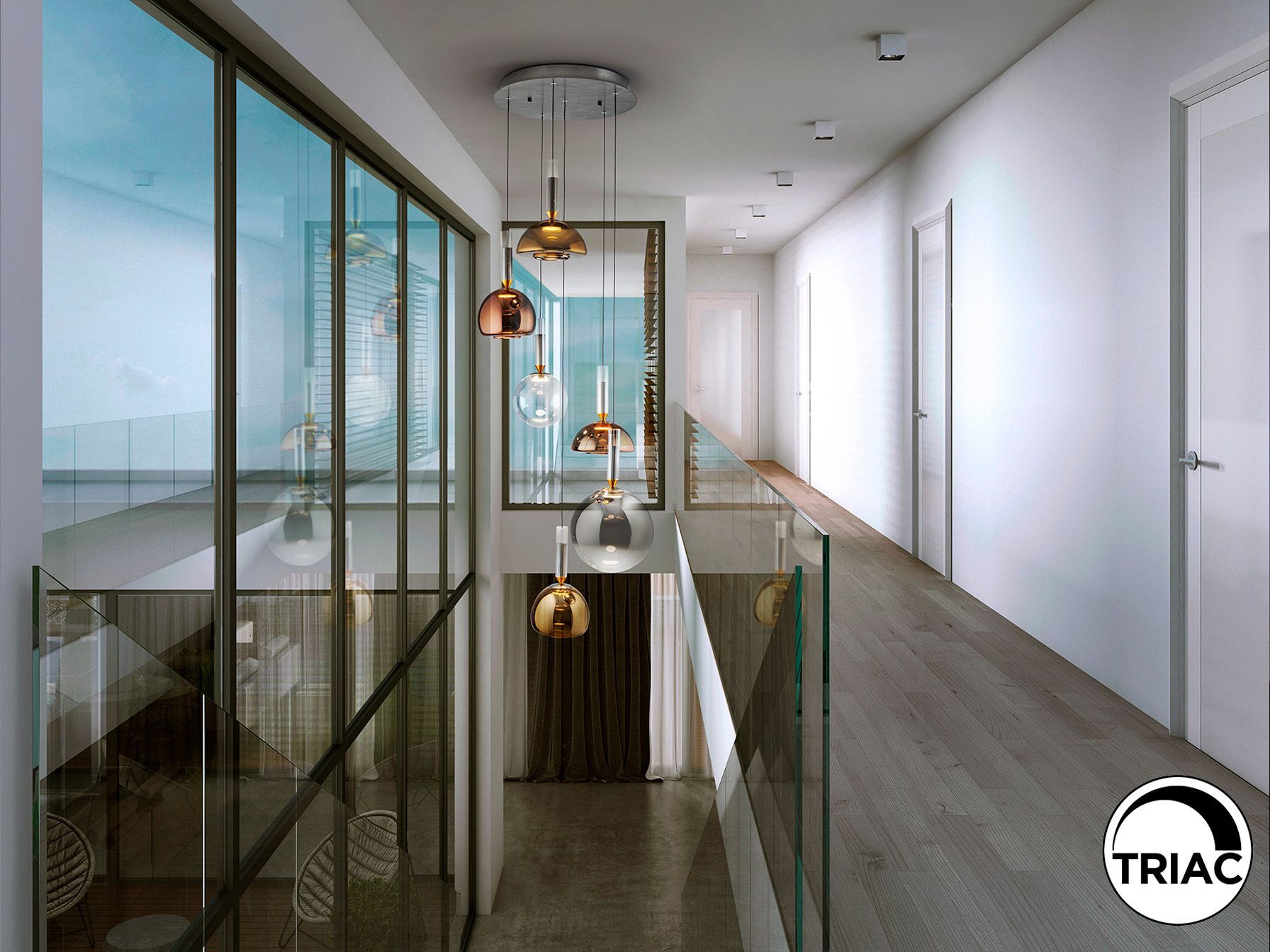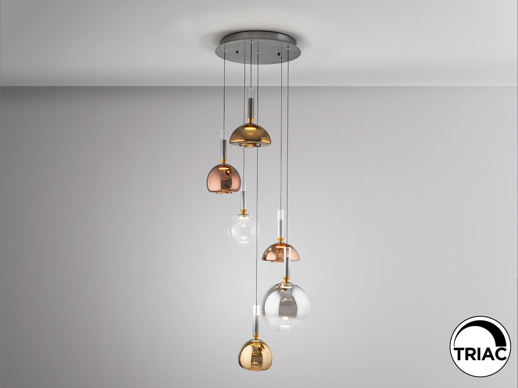 Лампа из 6 ламп, изготовленная из матового алюминия темно-серого оттенка. Плафоны из стекла с электролитическим покрытием медных, золотистых, серебряных и прозрачных тонов, со светодиодной подсветкой и опаловым акриловым рассеивателем. Светодиод мощностью 36 Вт, 1320 лм, 3000 К