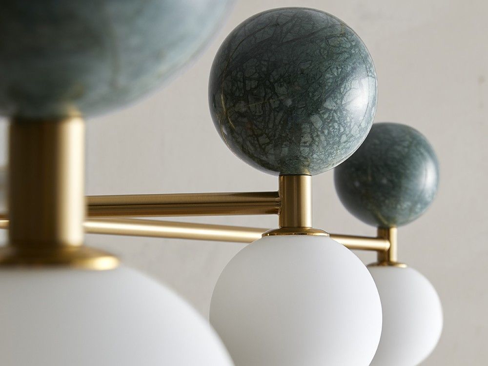 Подвесной светильник с шестью абажурами из сферического стекла, каждый из которых украшен мраморным элементом. Структура лампы выполнена из золота, а мраморные сферы доступны в зеленом или черном цвете.