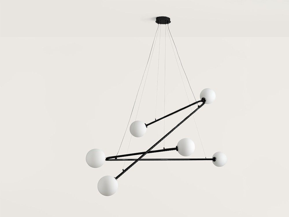 Люстра с 6 лампами, выполненная из металла в матовой черной или хромированной отделке и плафонами из опалового стекла.