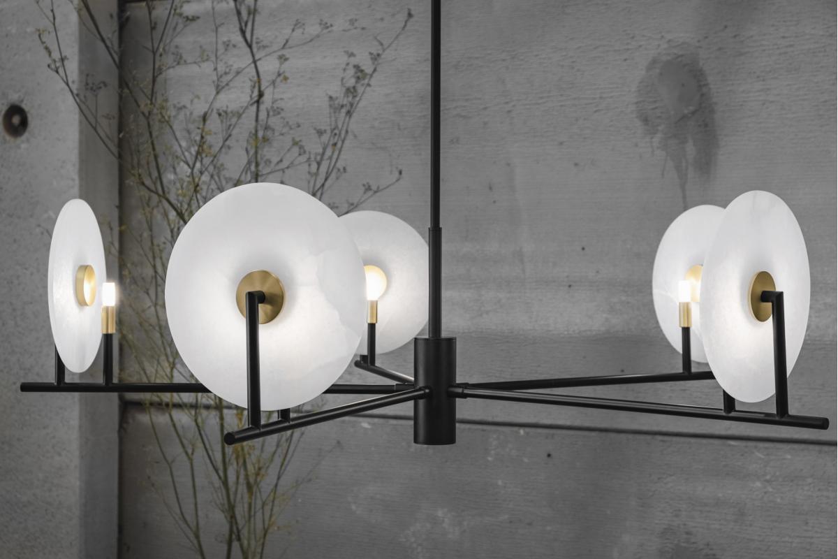 Подвесной светильник с матовой черной конструкцией и латунными деталями. Декоративные элементы из керамики, алебастра, золота или черного металла, полосатого металла или стекла различных цветов - не включены в комплект.