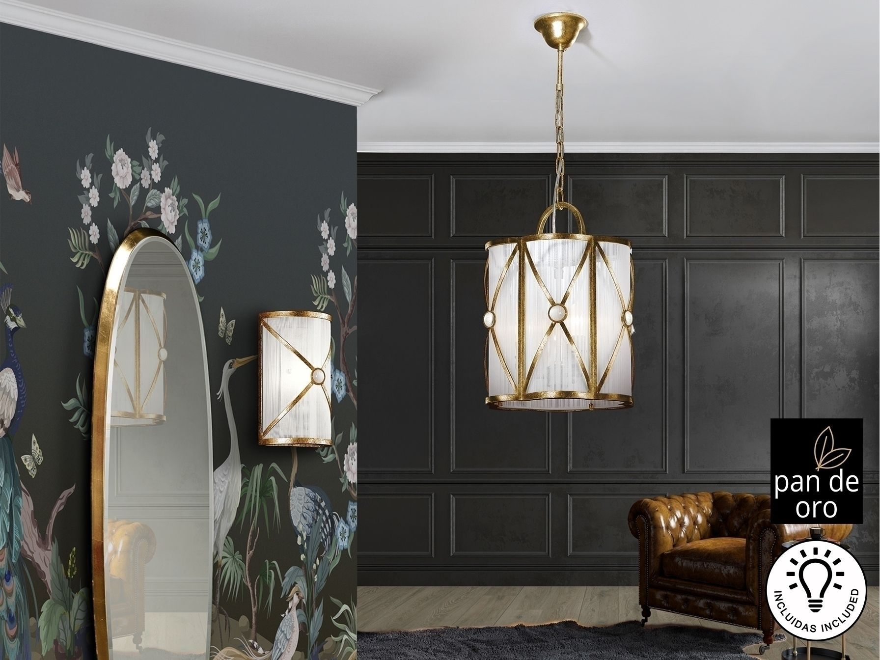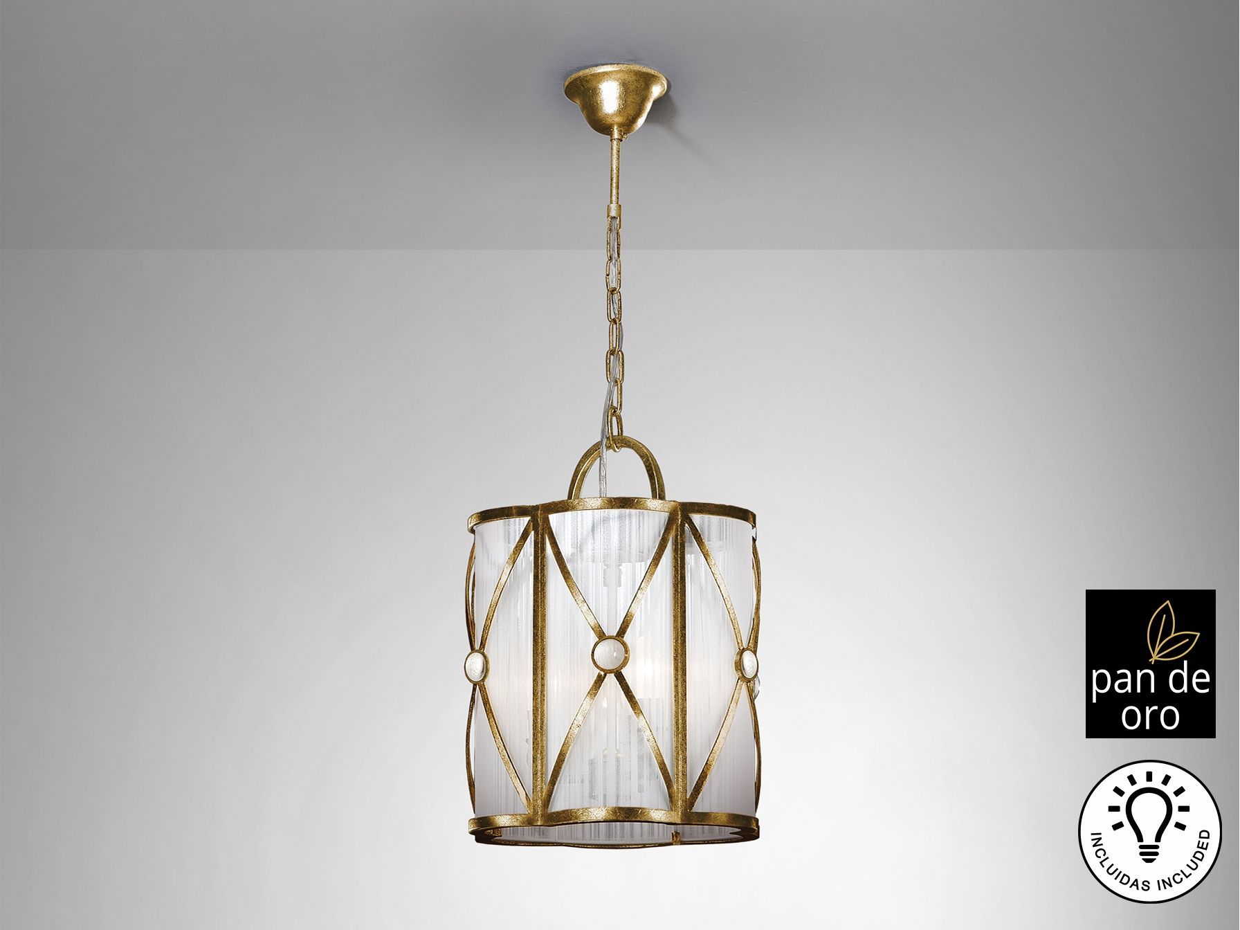 Люстра из 3-х ламп из металла с отделкой из состаренного ЗОЛОТА. Абажур из натянутой белой нити и украшение из прозрачного стекла в крестах.
