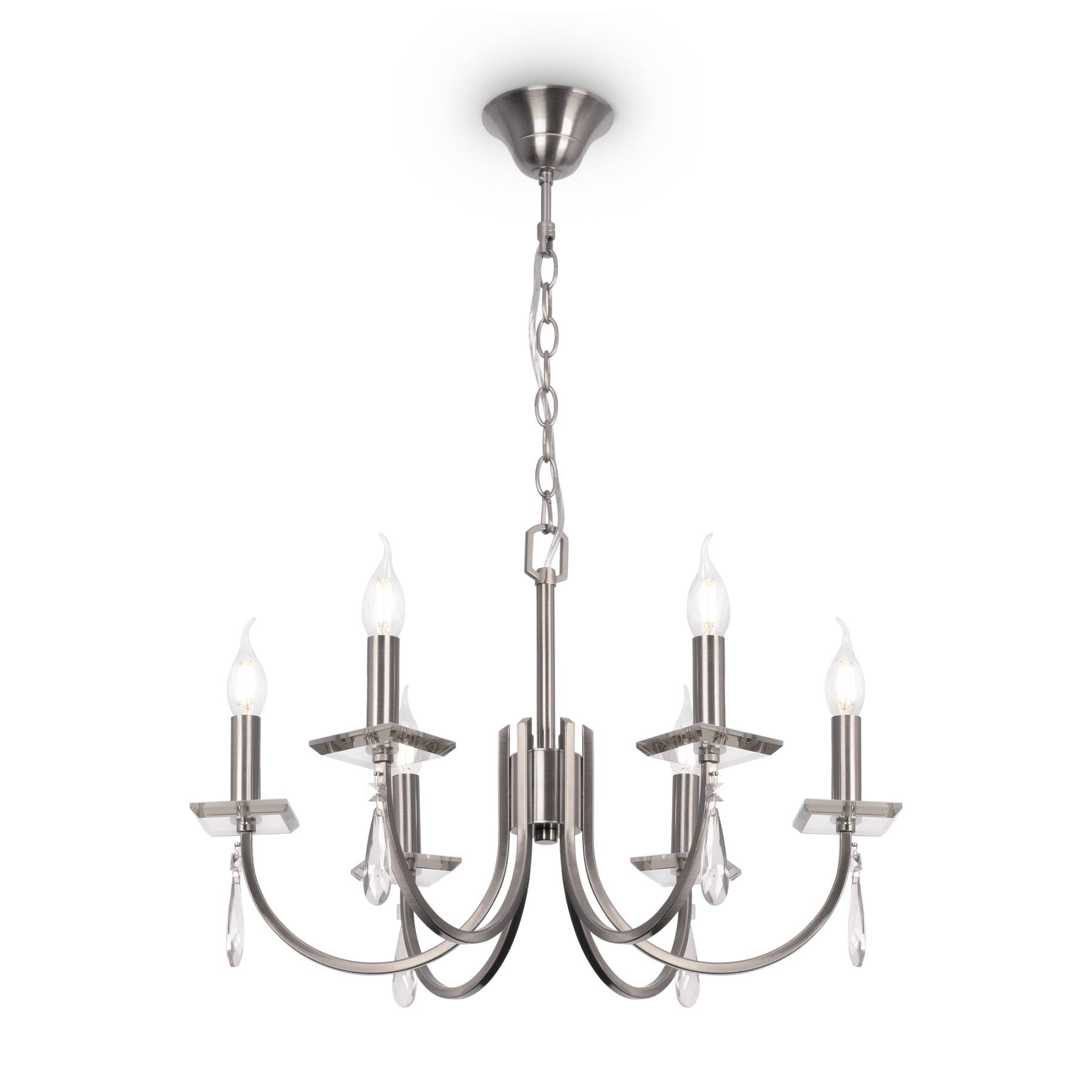 Металлическая арматура в двух оттенках: латунь и никель. Классическая форма плафона в виде свечи. Торшер и настольная лампа имеют тканевые абажуры. Белые – для арматуры цвета никель, оттенка кремовый шампань – для латунной. Декор – прозрачные хрустальные подвесы каплевидной формы. Торшер с цоколем Е27, лампа, бра и люстры – Е14.