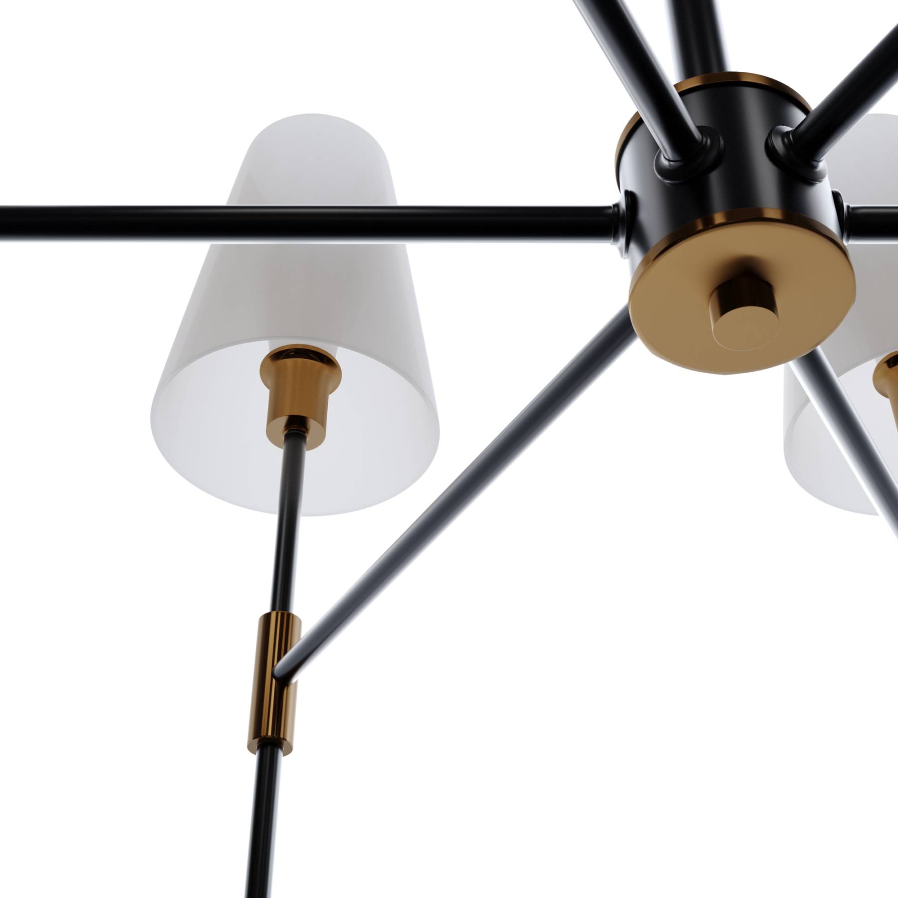 Материал арматуры – металл. Оттенки: хром, комбинация черного и латуни. Абажуры – белая ткань. Акцентный вытянутый силуэт. Источник света – лампа с цоколем E14.