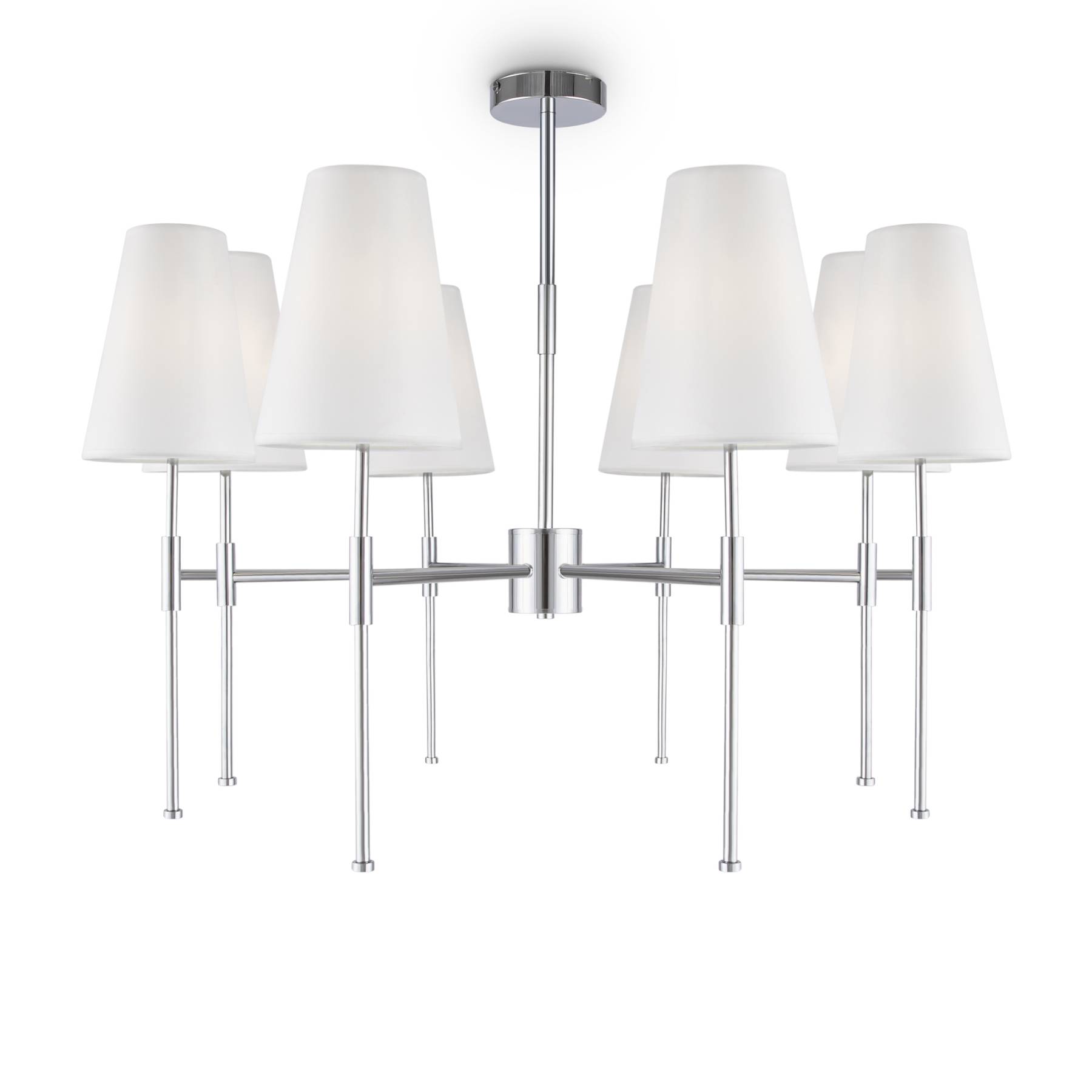 Материал арматуры – металл. Оттенки: хром, комбинация черного и латуни. Абажуры – белая ткань. Акцентный вытянутый силуэт. Источник света – лампа с цоколем E14.