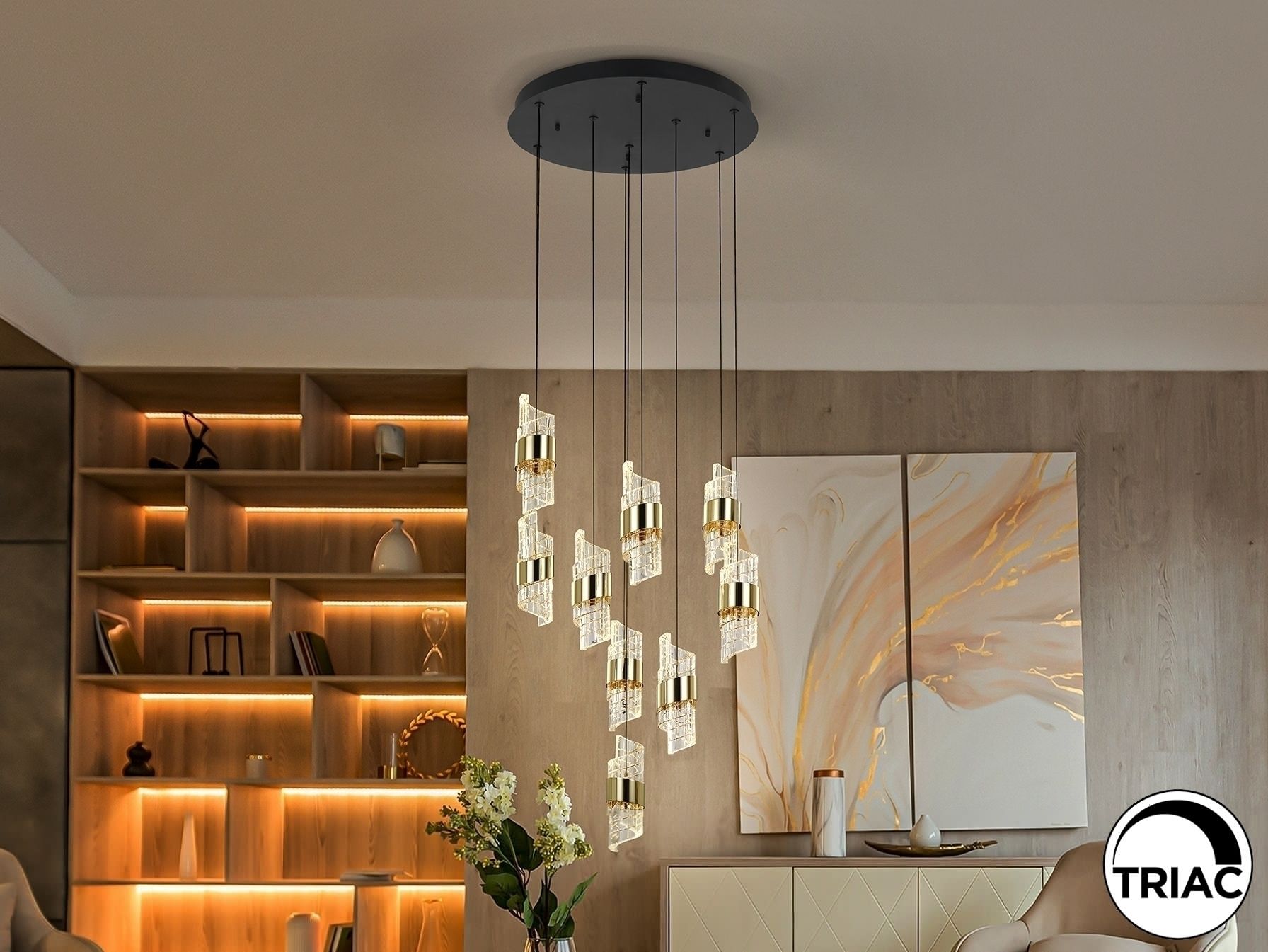 Лампа с 9 светодиодами. Изготовлена из металла с матово-черной и ярко-золотой отделкой. Абажуры со спиральным дизайном из формованного и резного акрила. Регулируемая высота. Светодиоды 63 Вт. 5537 лм. 3000 К. С РЕГУЛИРУЕМОЙ ЯРКОСТЬЮ