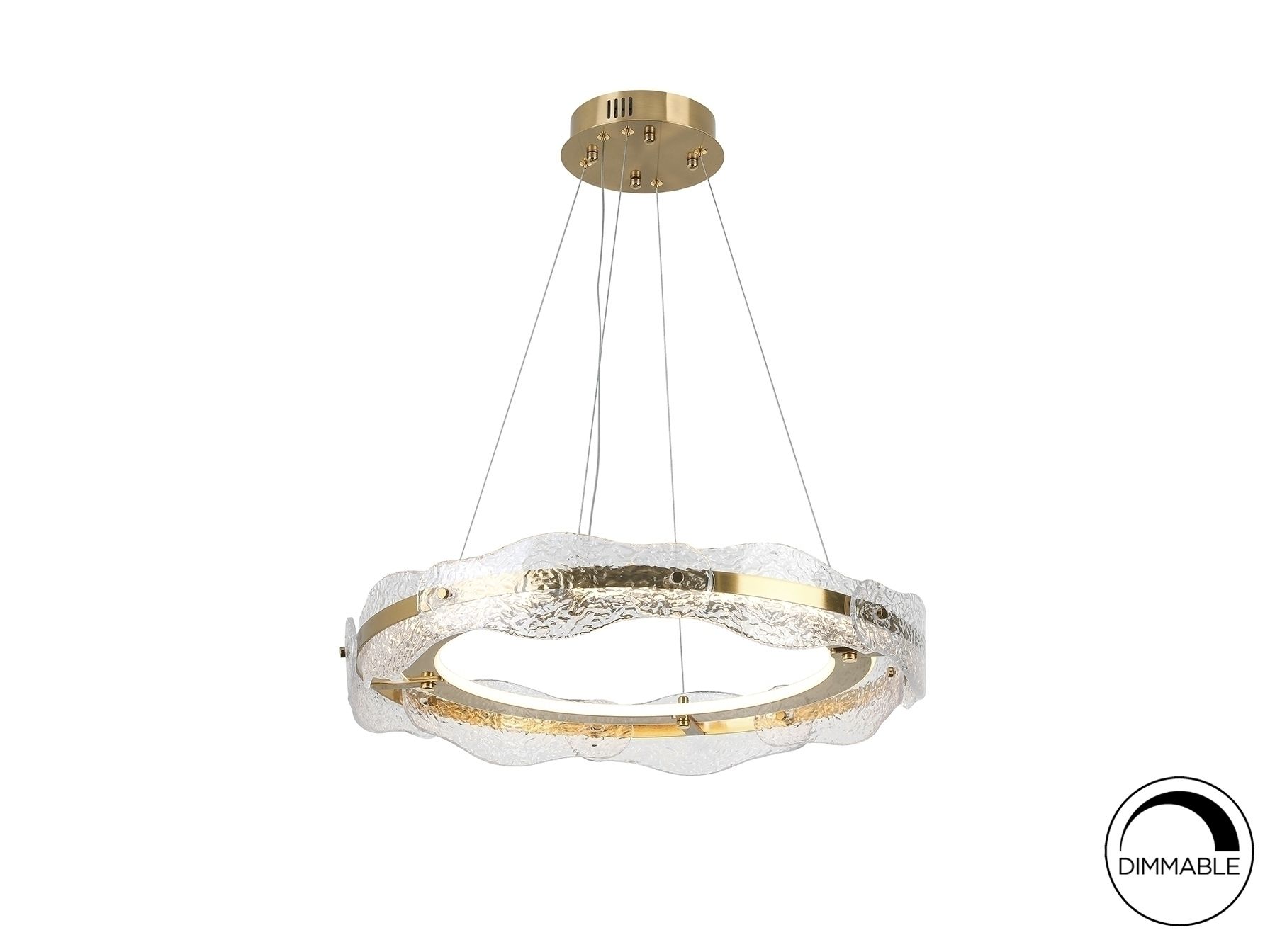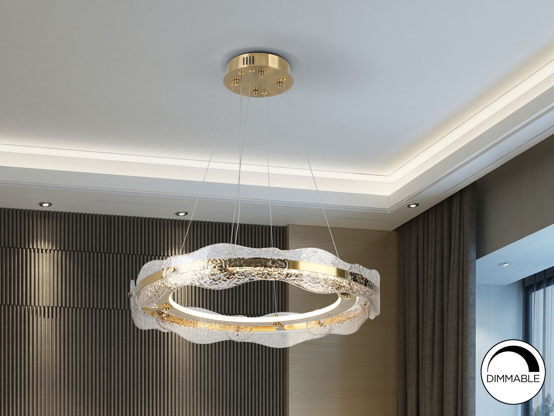 Светильник из металла и алюминия с отделкой матовым золотом. Рассеиватель из фактурных стеклянных пластин. Регулируемый по высоте. Светодиодное освещение 42Вт, 1800Лм, 3000К.