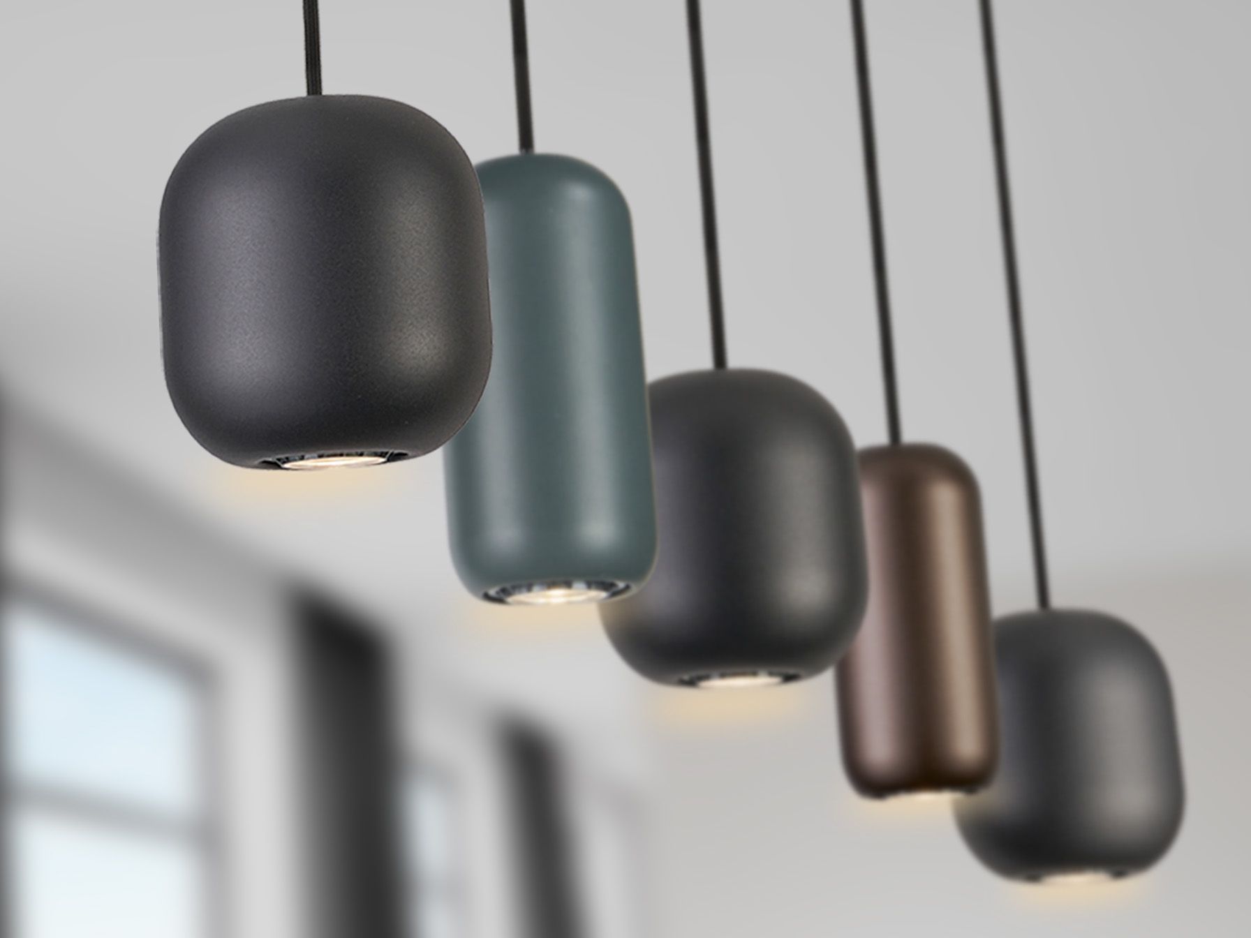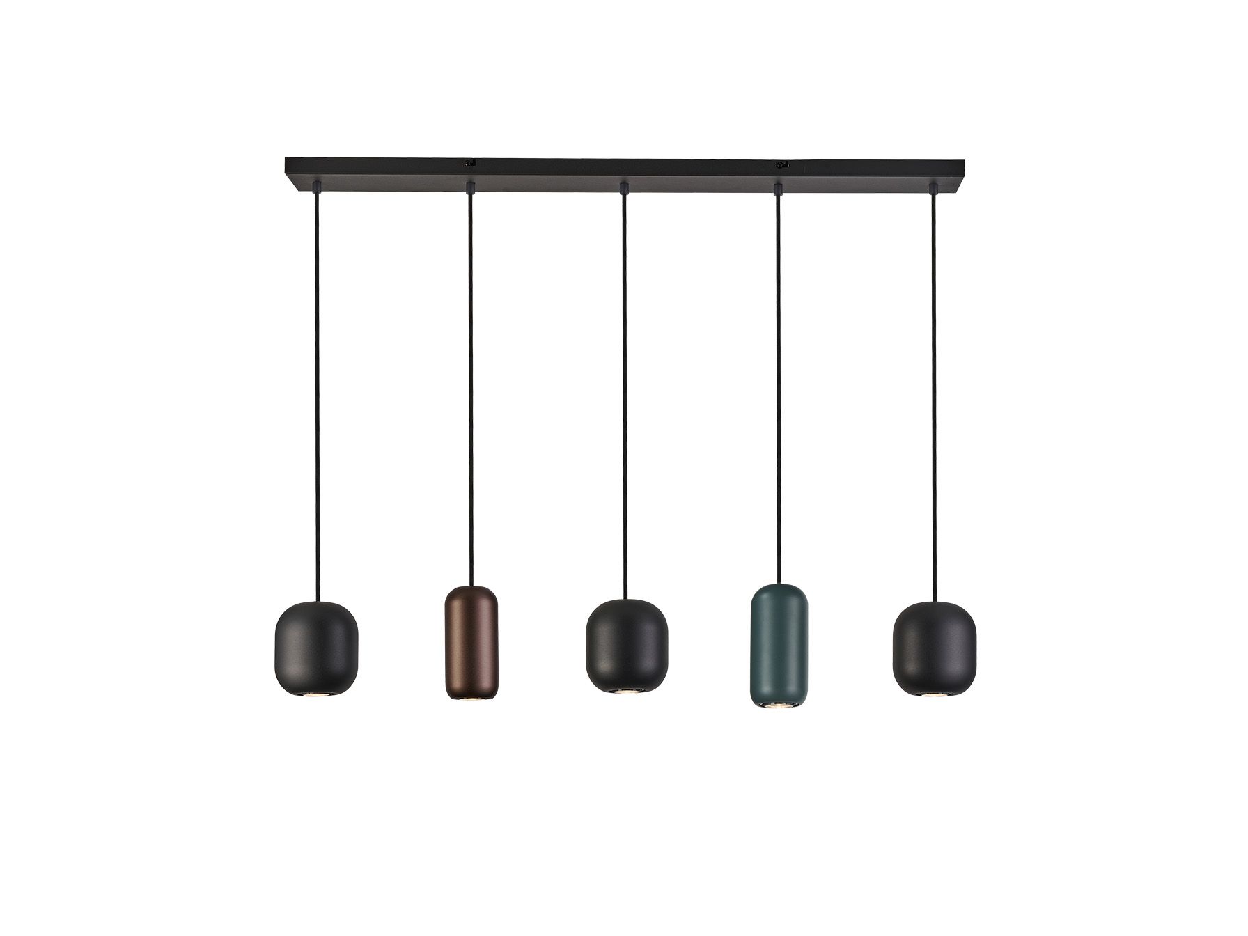Лампа из металла с матовой чёрной отделкой. 5 металлических плафонов матового чёрного, тёмно-коричневого и тёмно-зелёного цветов. Регулируется по высоте. Цоколь GU10.