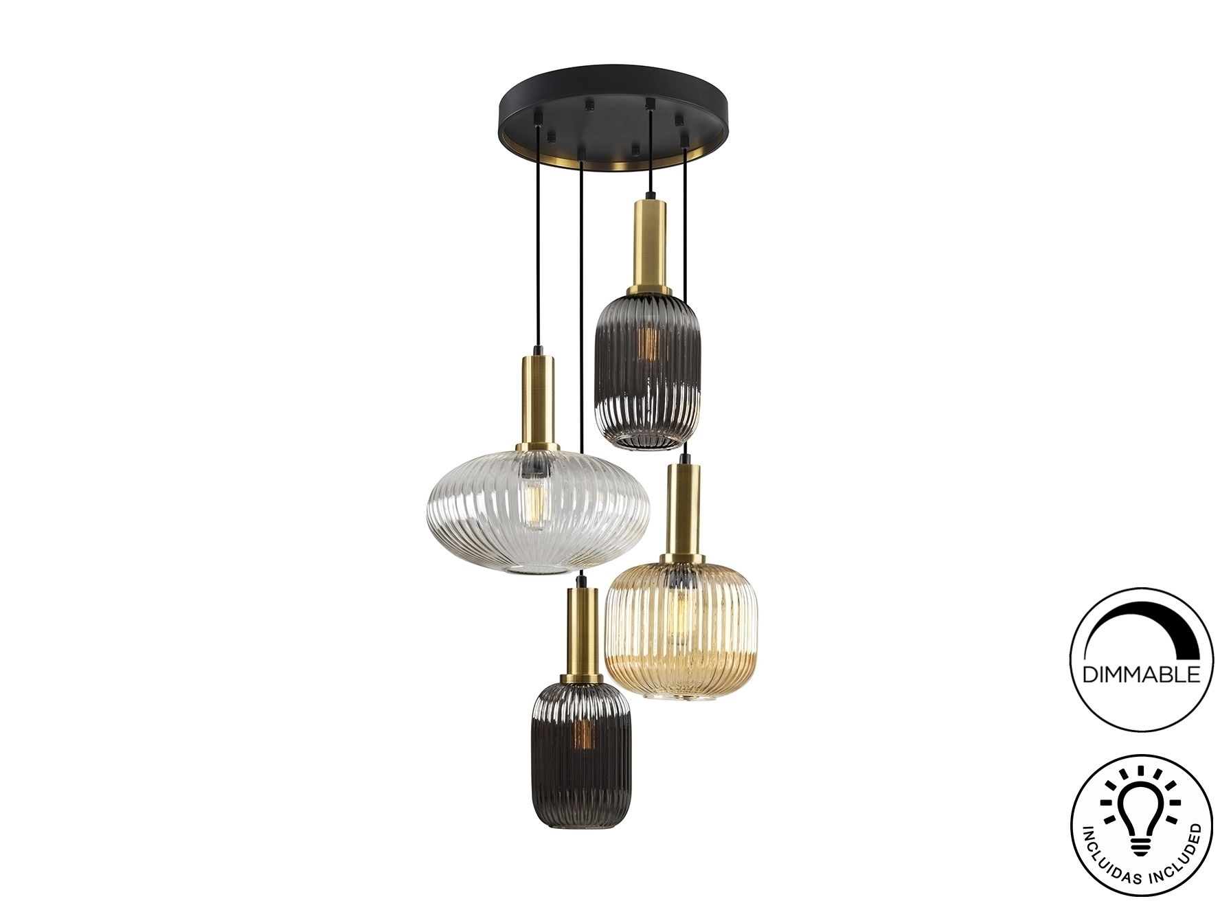 Люстра из 4 ламп из металла, окрашенного в черный матовый цвет, с деталями из сатинированной латуни. Абажуры из формованного стекла прозрачного, янтарного и мерцающего дымчато-серого цвета. Регулируется по длине.