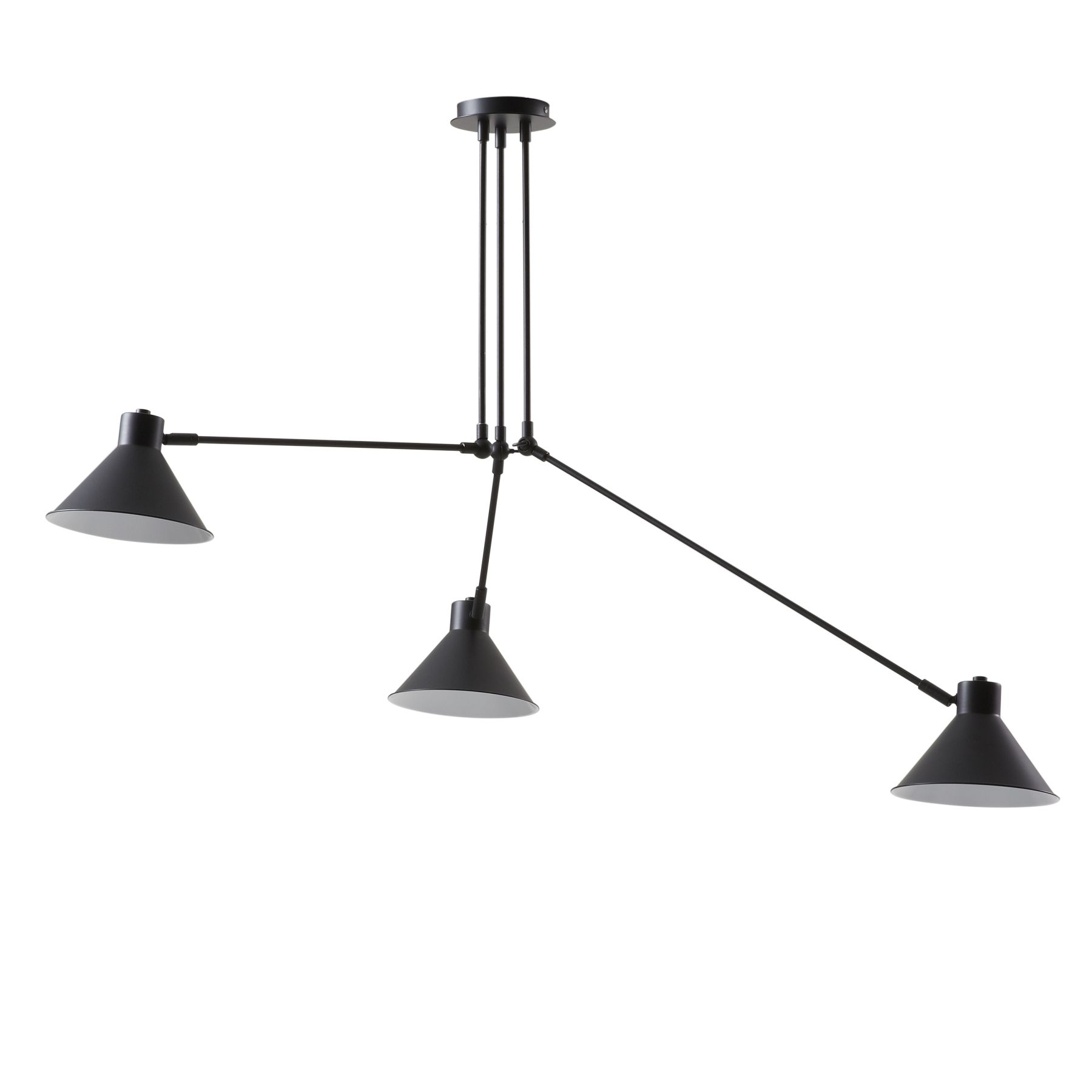 Подвесной светильник Odine от фабрики La Forma (ex Julia Grup) – осветите каждый дюйм вашего пространства. Подвесной светильник Odine имеет три источника света, которые вы можете перемещать по своему желанию. Поэтому Odine идеально подойдет для создания вашей дизайнерской атмосферы в любой момент. Зачем довольствоваться одним световым потоком, когда можно иметь три? Подвесной светильник состоит из трех направляющих с абажурами, выполненных из металла. Толщина направляющих – 1 см. Сталь окрашена в черный матовый цвет методом порошкового покрытия. Каждая направляющая сгибается под разным углом на расстоянии 40 см от места крепления с потолочной коробкой. Для светильника рекомендуется использовать энергосберегающие лампы со следующими характеристиками: цоколь – Е14, мощность – 25 Вт, класс энергопотребления – Е-А++, максимальная энергоэффективность – A++. Размеры светильника: ширина – 80 см, высота – 80 см, глубина – 58 см. Высота абажура 14 см. Вес – 2,0 кг. Сборка не требуется. В коллекцию Odine также входит напольный торшер и настенная лампа в белом и черном цвете.