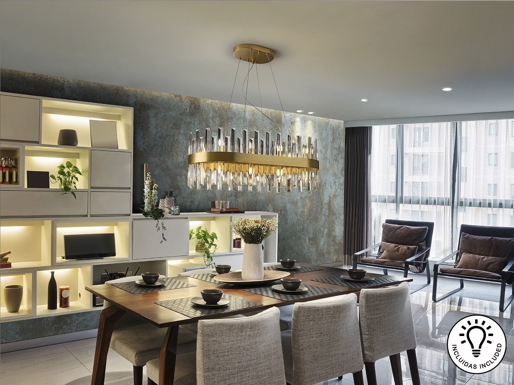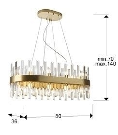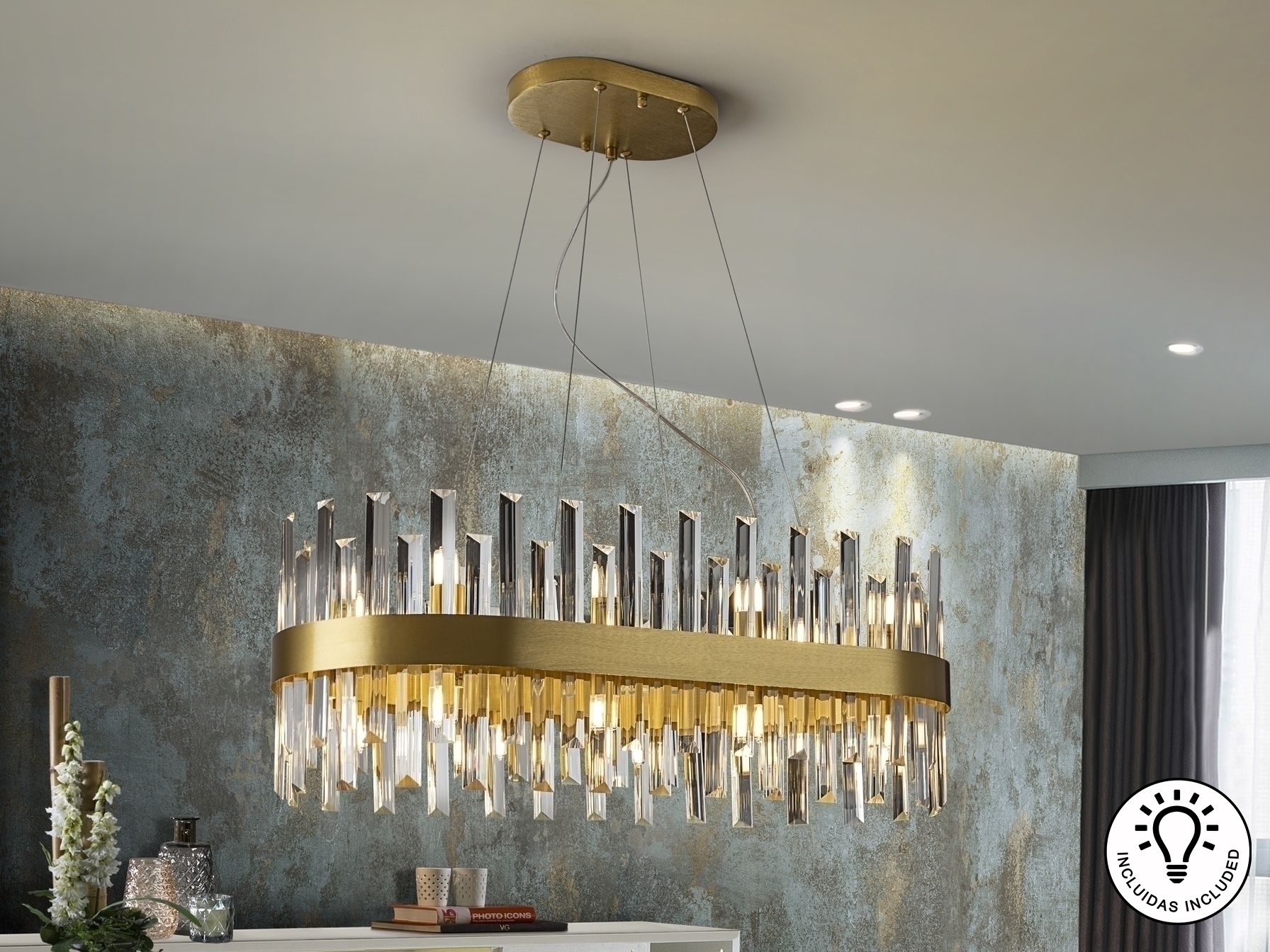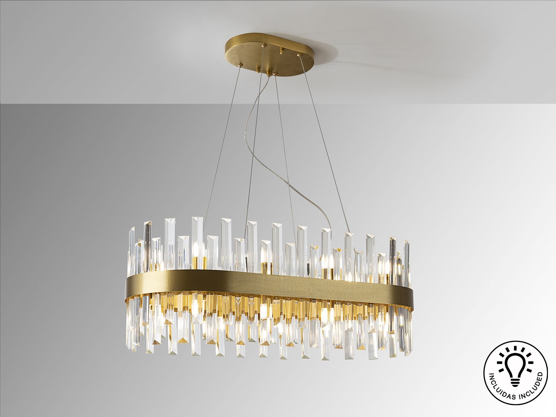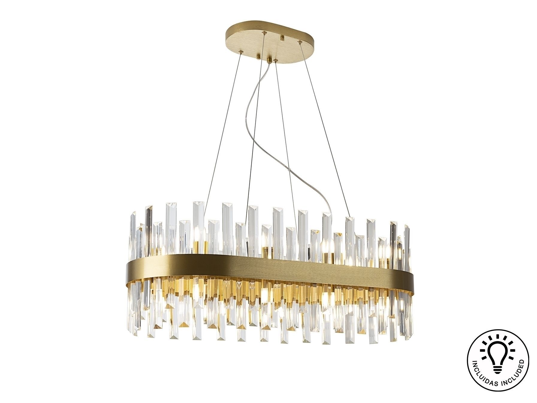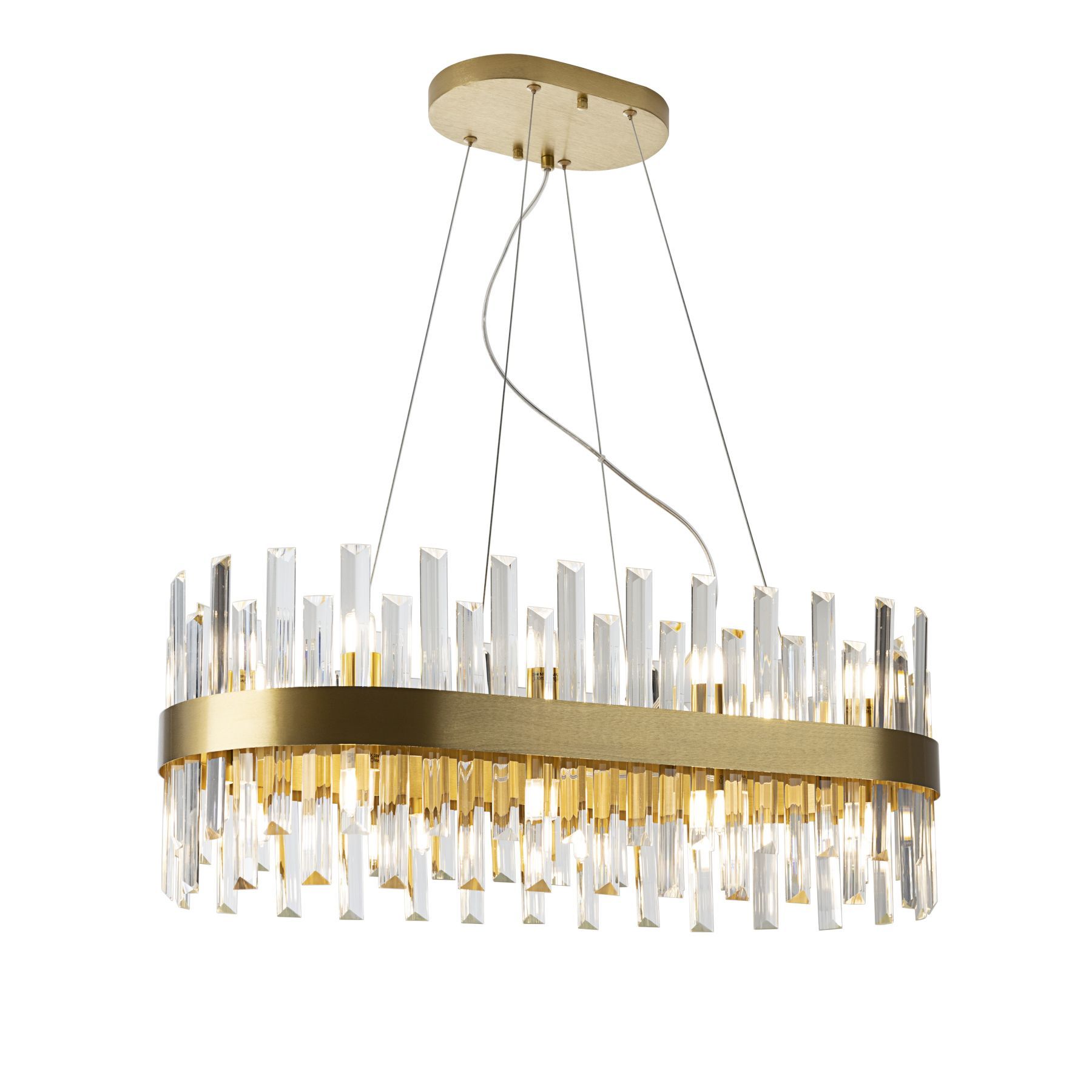 Овальный светильник на 20 лампочек из матового металла с позолотой. Рассеиватель из прозрачного стекла призматической формы.