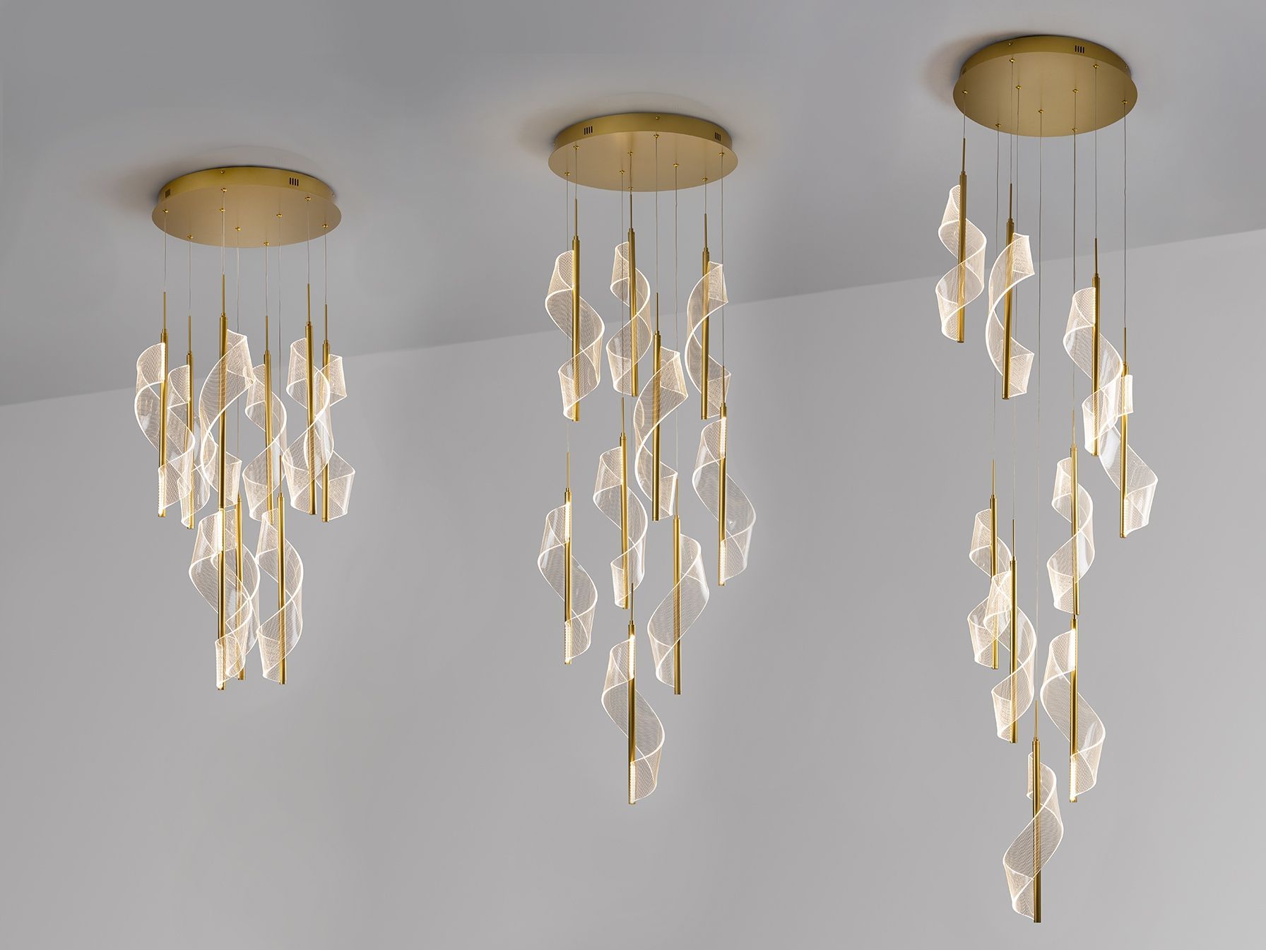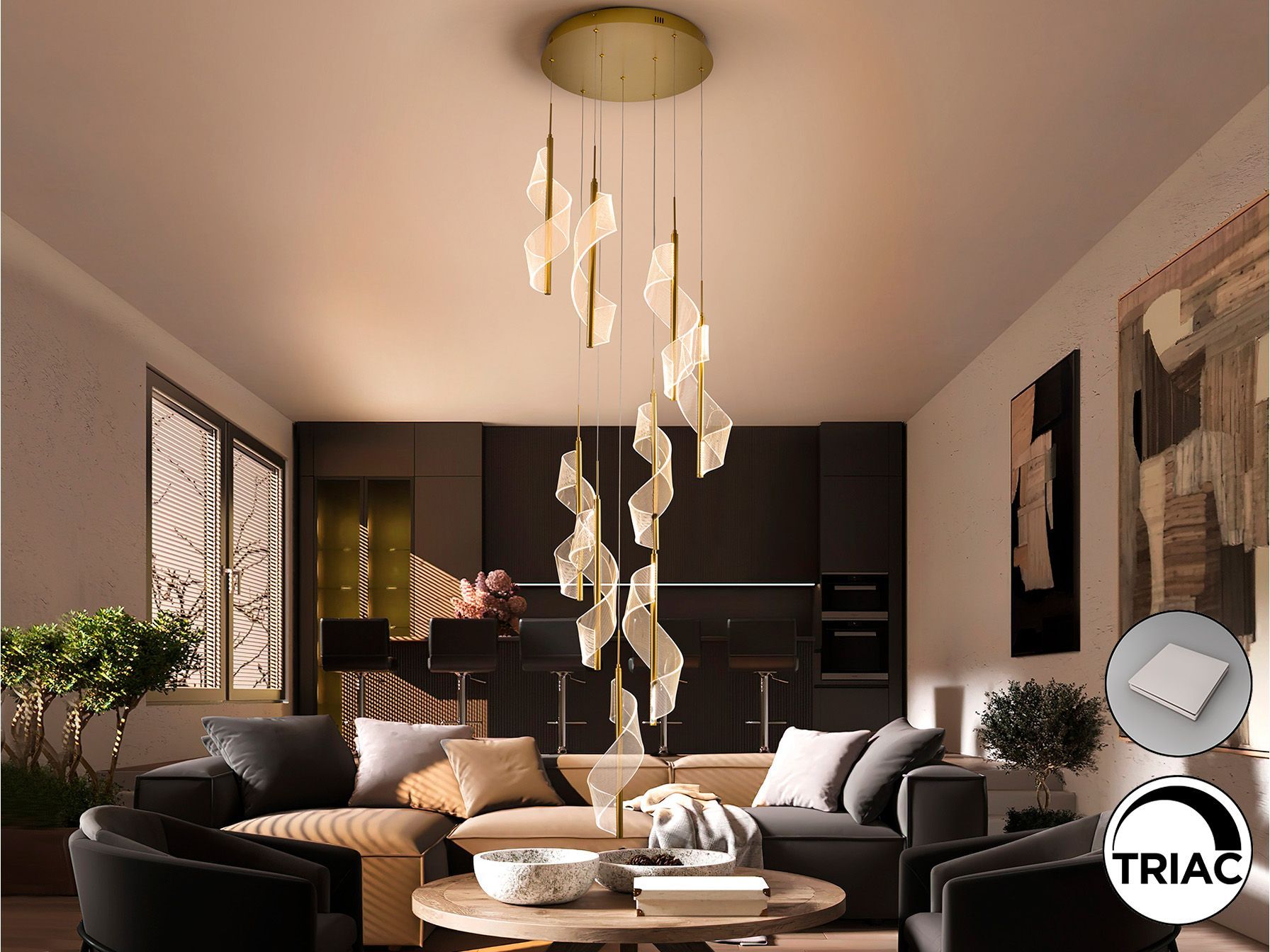 Лампа из 9 светодиодов, изготовленная из металла и алюминия, с матовым золотым покрытием. Диффузоры из литого метакрилата с микропечатью. Регулируемая высота. Светодиод 78 Вт, 4250 лм, 3000 К. С возможностью диммирования. Драйвер TRIAC и комплект для диммирования в комплекте.