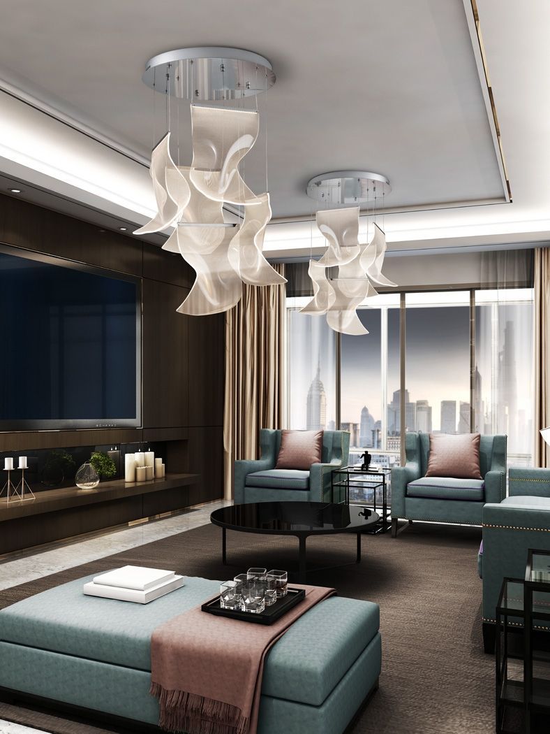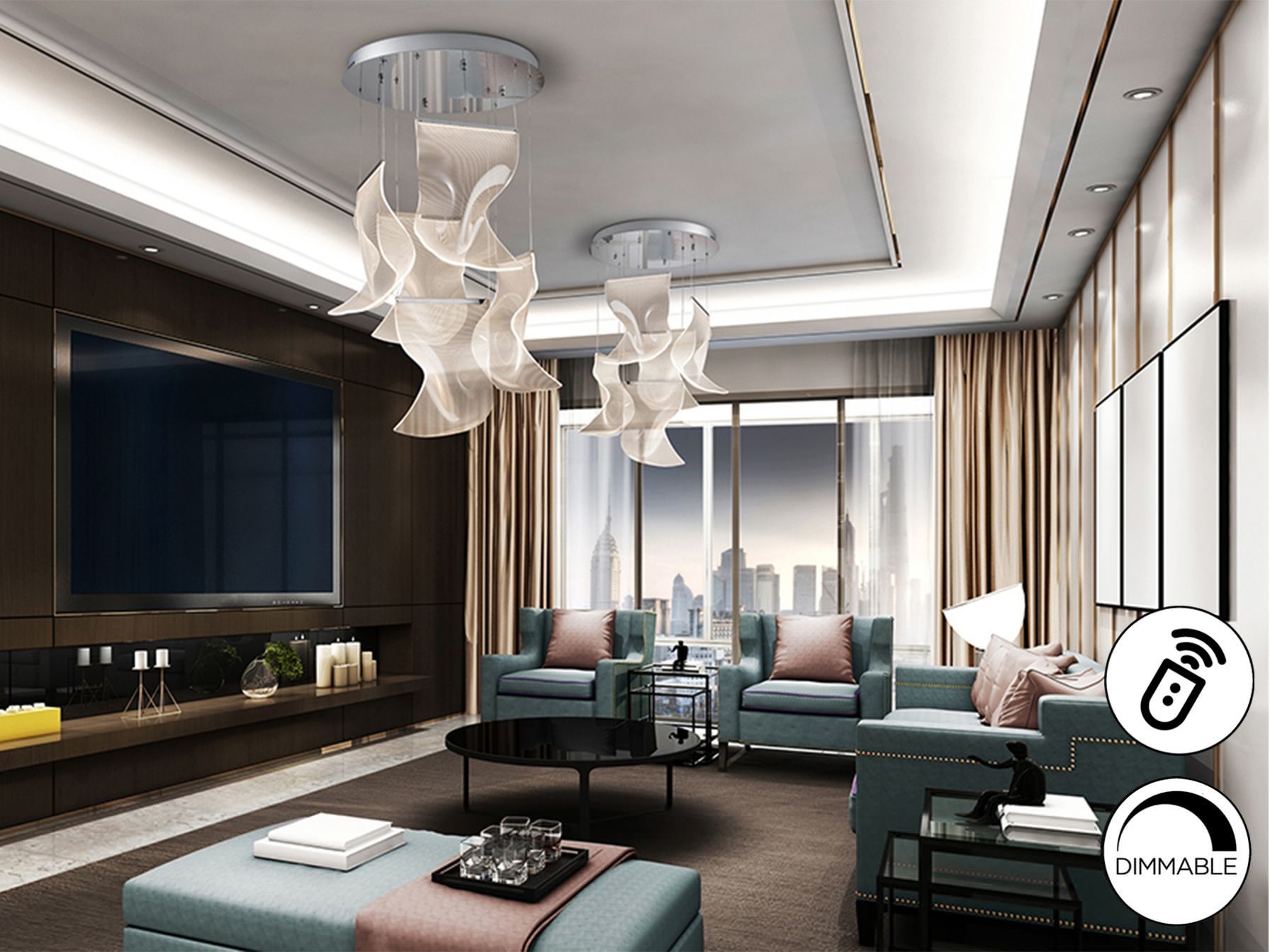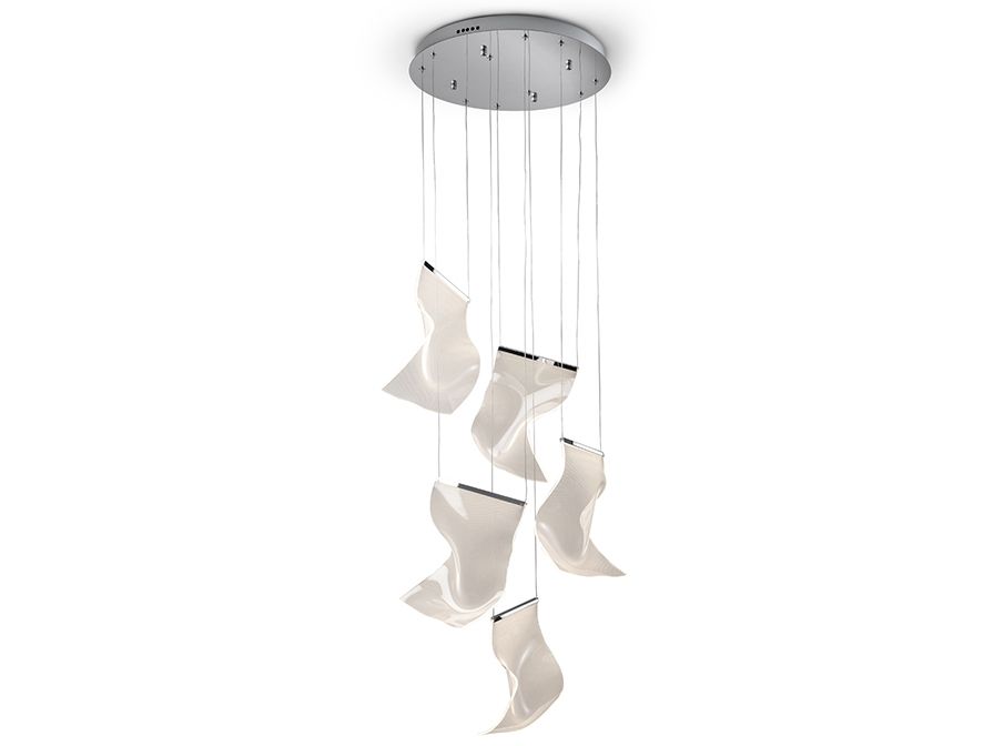 Светильник изготовлен из хромированного металла и абажуров из формованного метакрилата с микропечатью. Светодиодное освещение 25Вт 1500 лм. 3000К. Диммируемый. В комплект входит пульт дистанционного управления.R