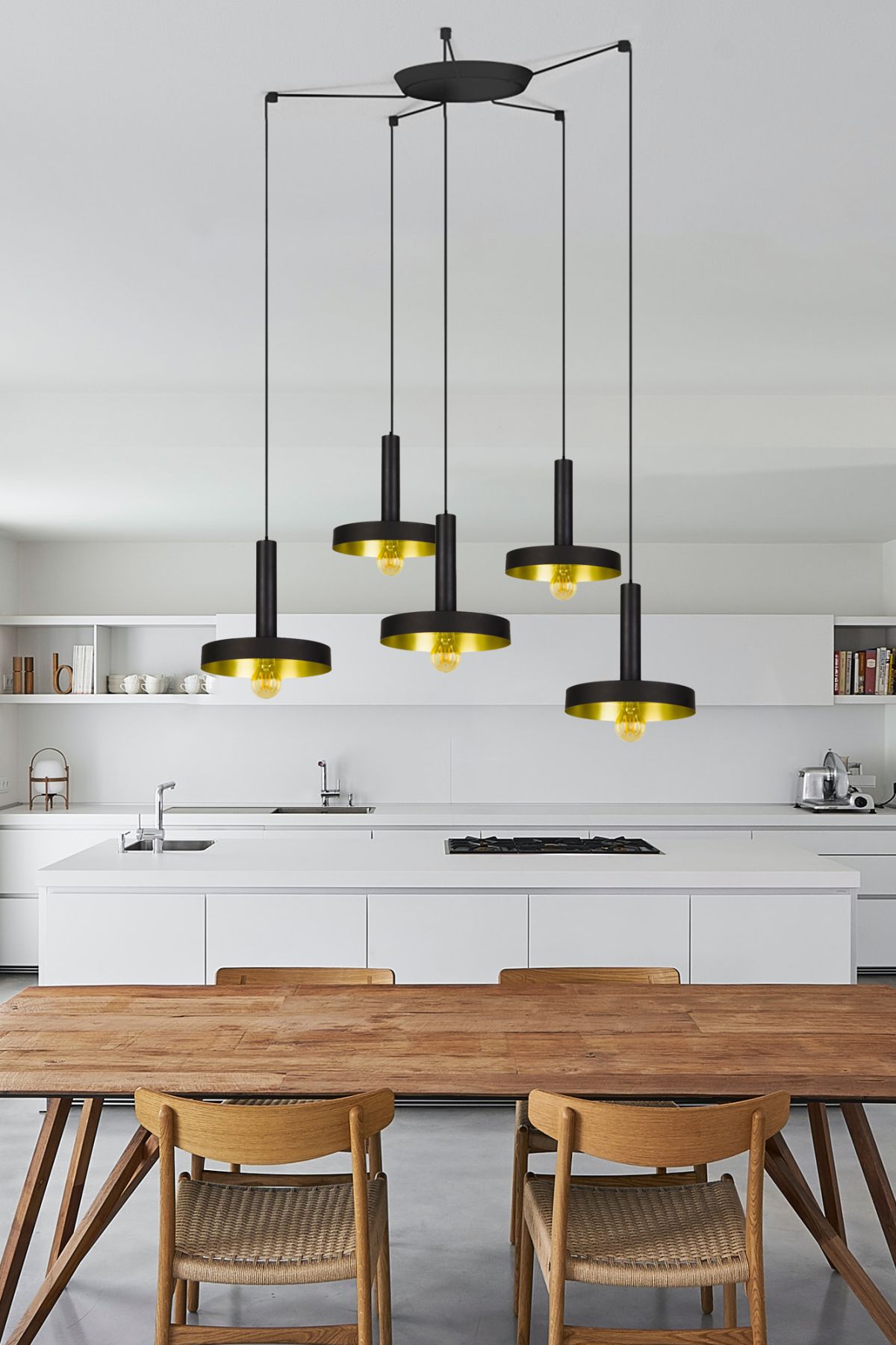 WHIZ - это семейство дизайнерских светильников, созданное Кристофом Фридрихом Вагнером, которое включает в себя модные отделки, такие как сочетание атласного золота и черного. Этот дизайнерский кулон в черно-золотом цвете отлично подойдет для интерьерного освещения. Версия с многократной потолочной розеткой с 5 лампами.