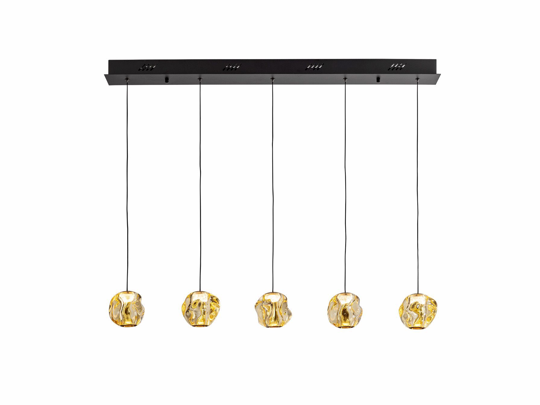 Лампа из 5 светодиодов, изготовленная из металла, покрытого матовой чёрной краской, с бронзовыми деталями и янтарными акриловыми плафонами. 21 Вт, 1391 лм, 3000 К. В комплект входит драйвер TRIAC и набор для диммирования.