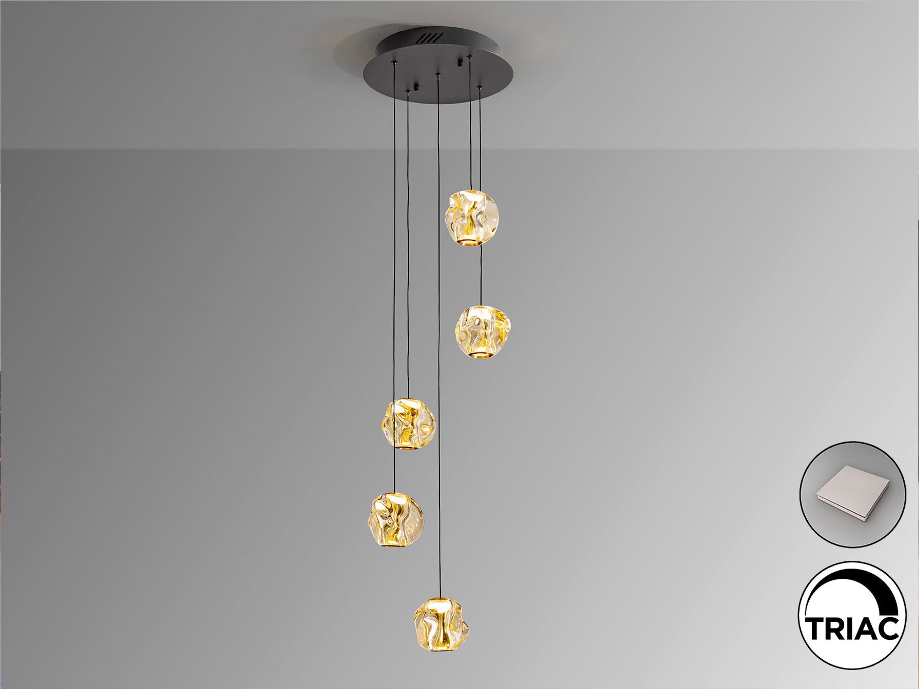 Лампа из 5 светодиодов, изготовленная из металла, покрытого матовой чёрной краской, с бронзовыми деталями и янтарными акриловыми плафонами. 21 Вт, 1304 лм, 3000 К. В комплект входит драйвер TRIAC и набор для диммирования.