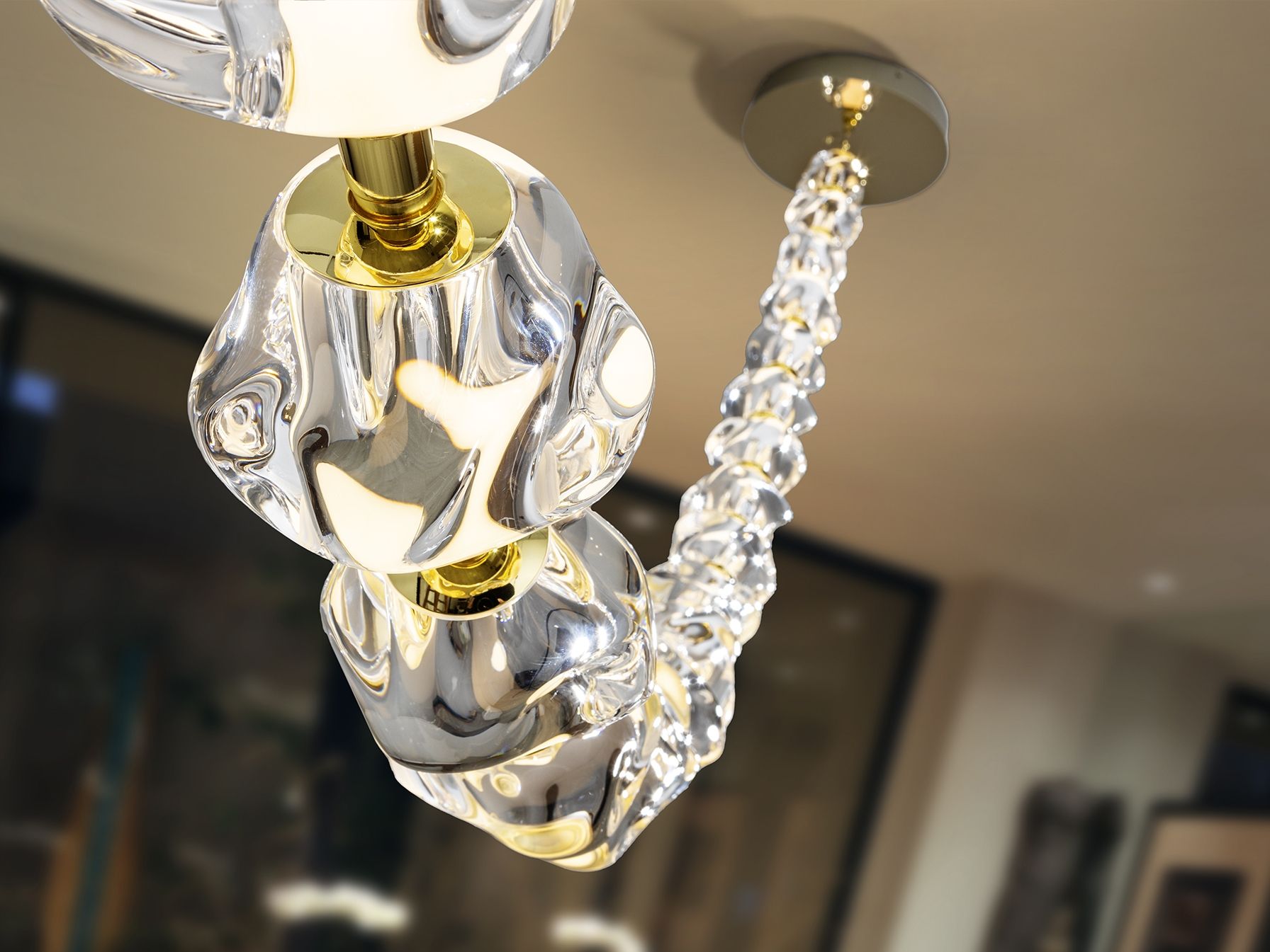 Лампа из металла золотистого цвета и 21 прозрачный акриловый абажур. Светодиод 75,50 Вт, 7129 лм, 3000 К. В комплекте драйвер TRIAC и набор DIM.