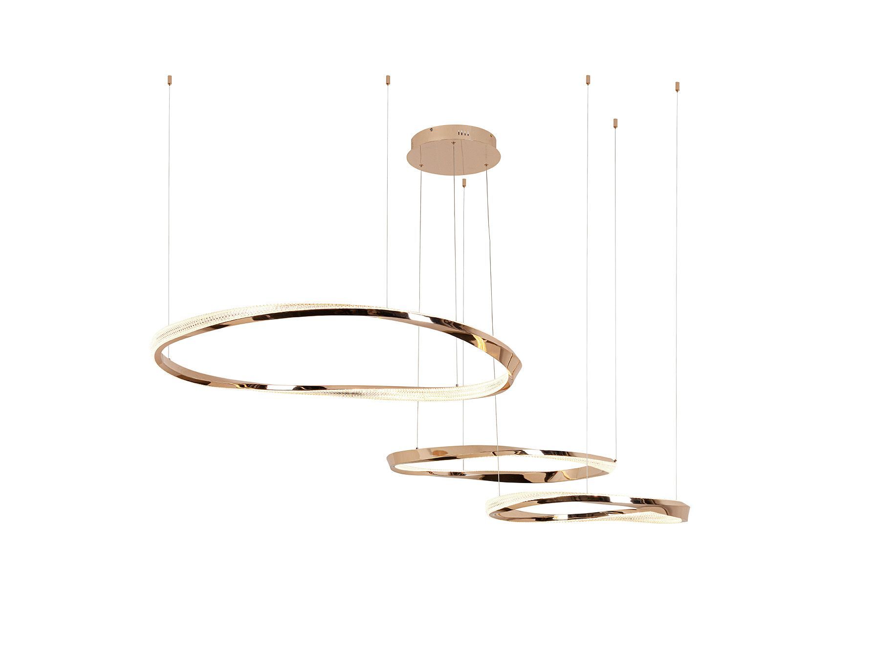 Лампа из 3 колец (Ø60, Ø80, Ø100 см), изготовленных из стали и алюминия, с блестящим золотым покрытием. Прозрачный гранёный акриловый рассеиватель. Регулируется по высоте. Светодиод мощностью 120 Вт, 8400 лм, 3000 К. С возможностью регулировки яркости. В комплект входит драйвер TRIAC и набор для регулировки яркости.