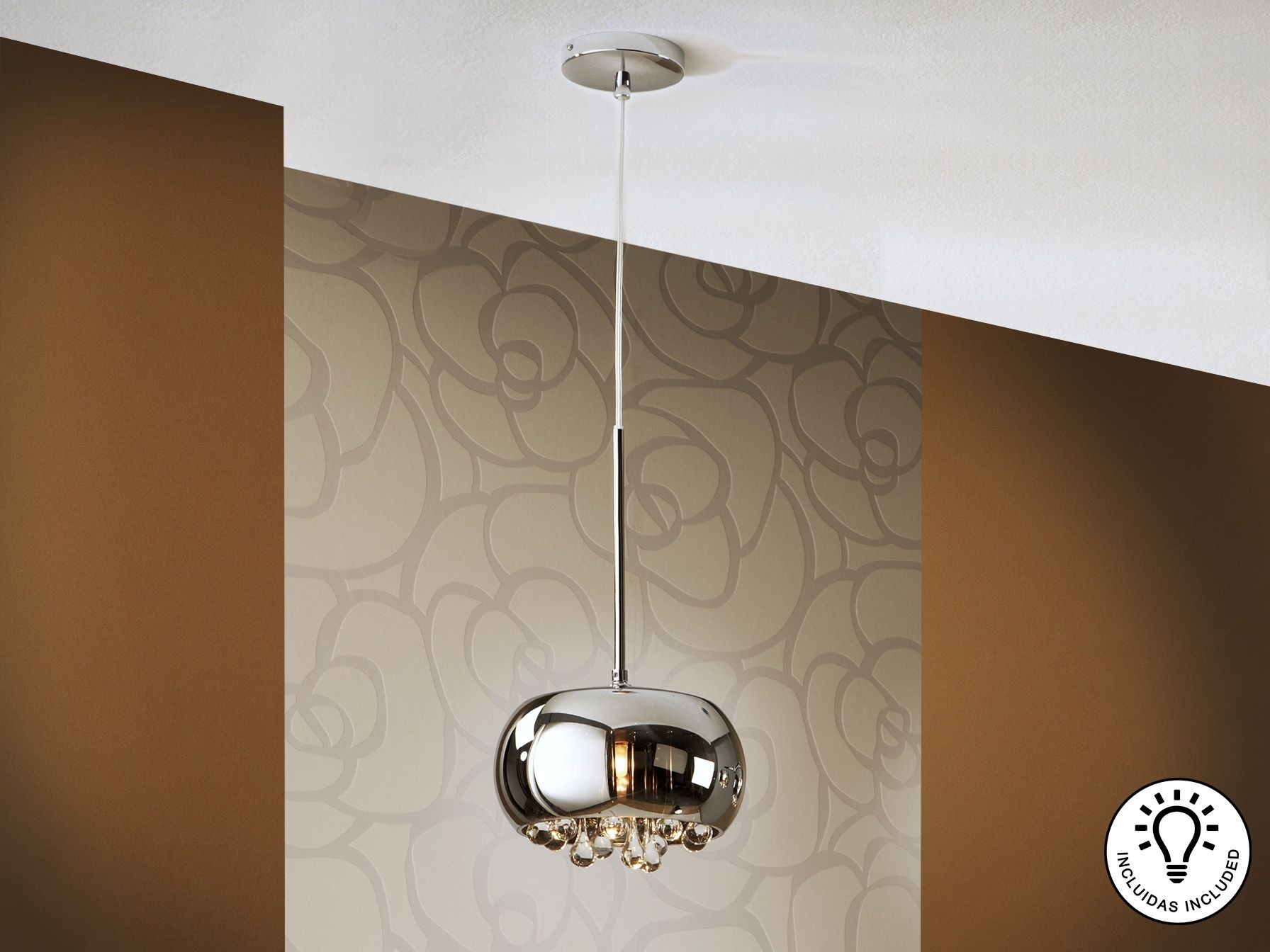 Подвесной светильник из металла с покрытием "хром", плафон из зеркального стекла с подвесками внутри из стекла подобного муранскому,