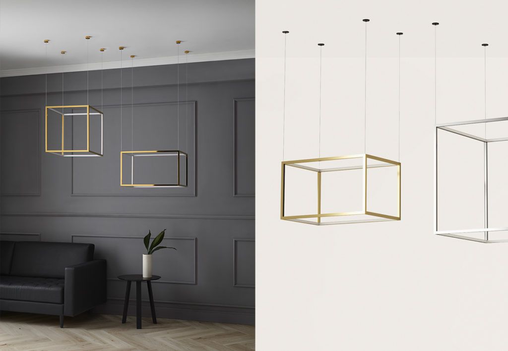 Подвесной светильник в форме металличtского куба c хромированной или золотой отделкой, доступен в различных размерах. Регулируется по высоте.
