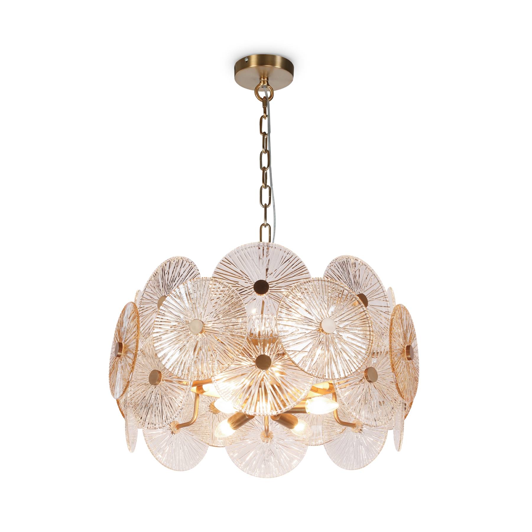 Металлическая арматура в золотом цвете. Сферический декор из штампованного рельефного стекла. Комбинация янтарного и прозрачного оттенка в декоре. Регулируемая высота.