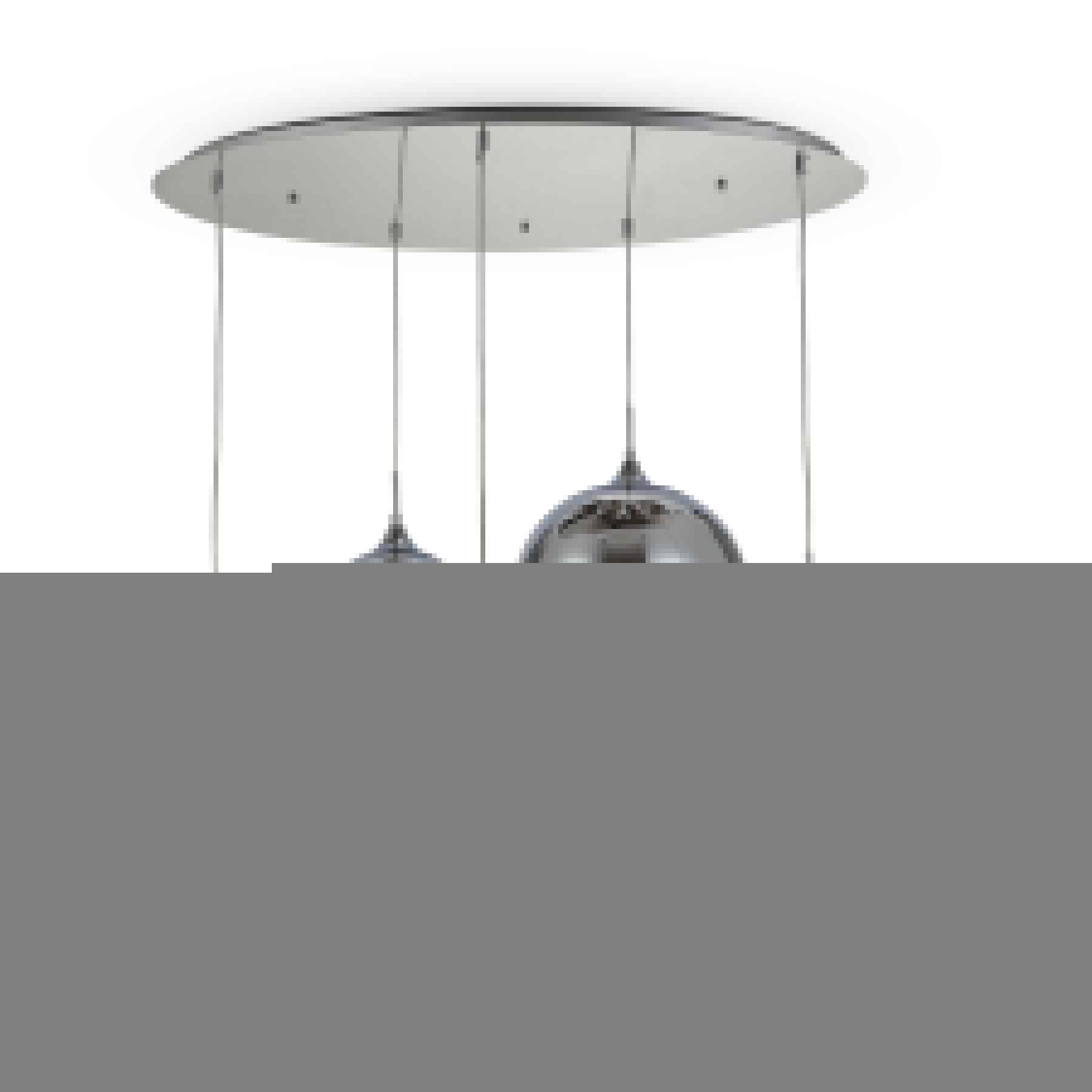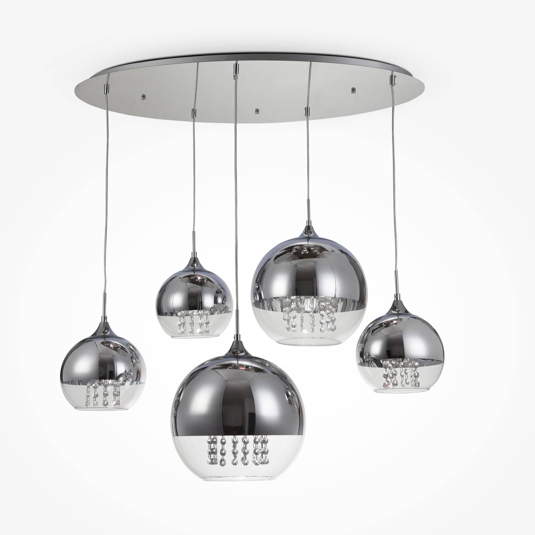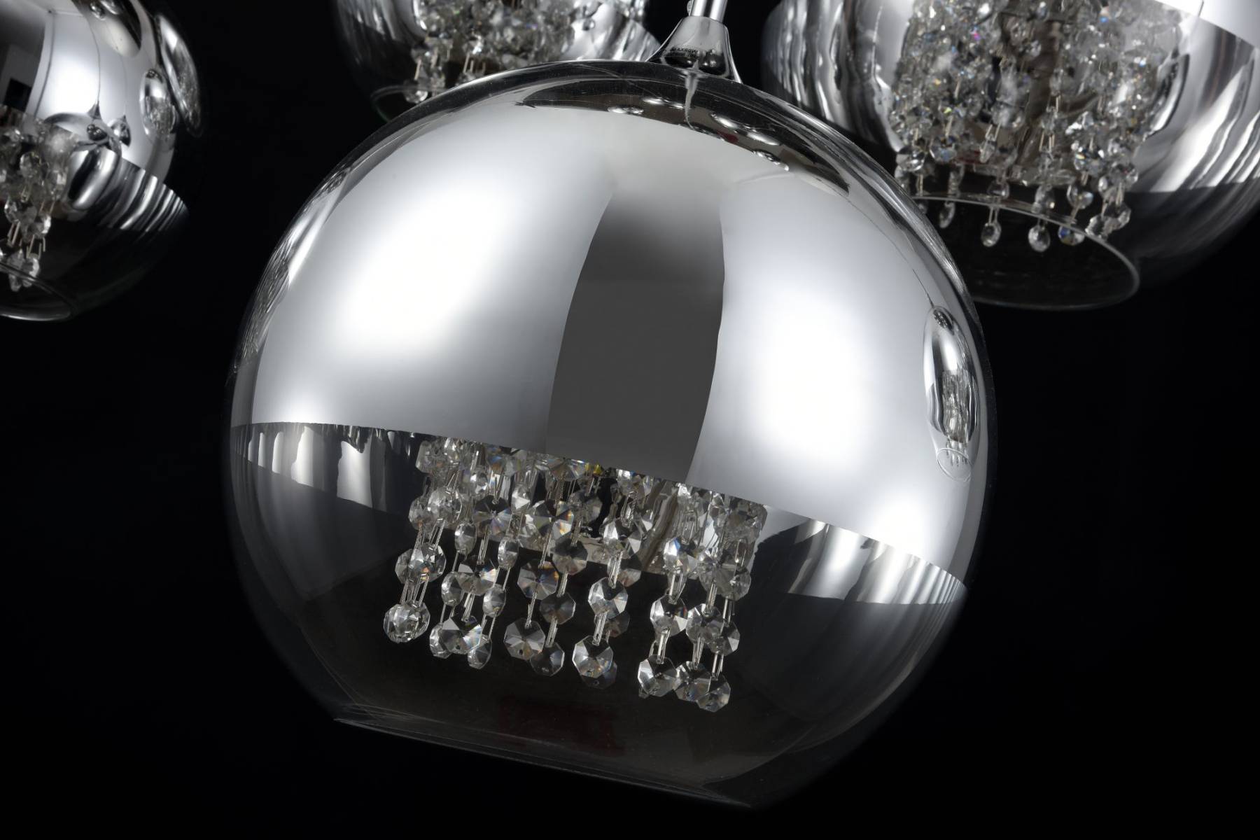 Арматура из металла в двух оттенках: никель и золото. Часть плафона выполнена из металла в тон арматуре, другая часть — из прозрачного стекла. Декоративные подвески внутри плафонов. Регулируемая высота.