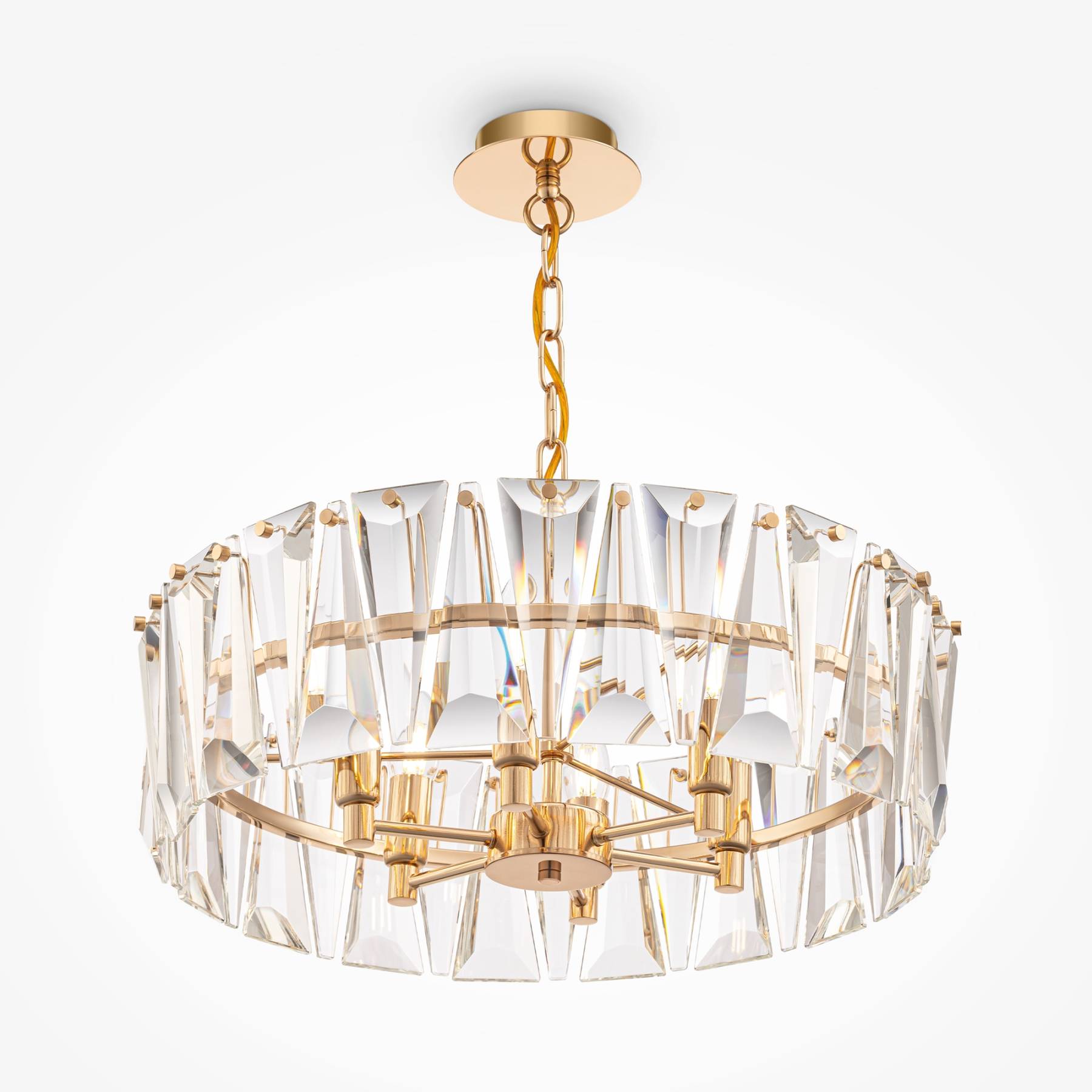 Материал арматуры – металл, оттенки – хром и золото. Декор – массивные крис таллы сложной огранки. Высота подвесных моделей регулируется длиной цепи. Источник света - лампа с цоколем Е14.
