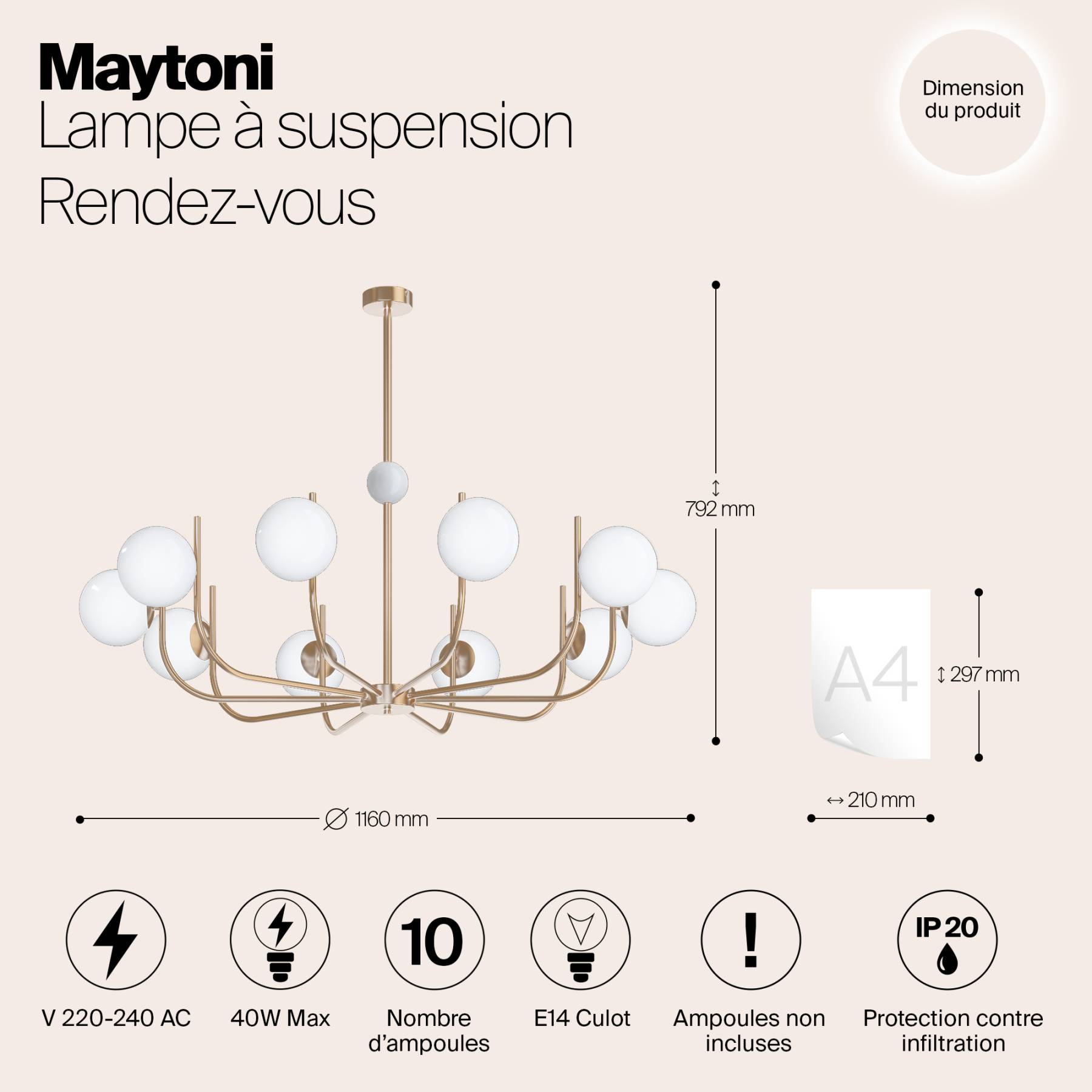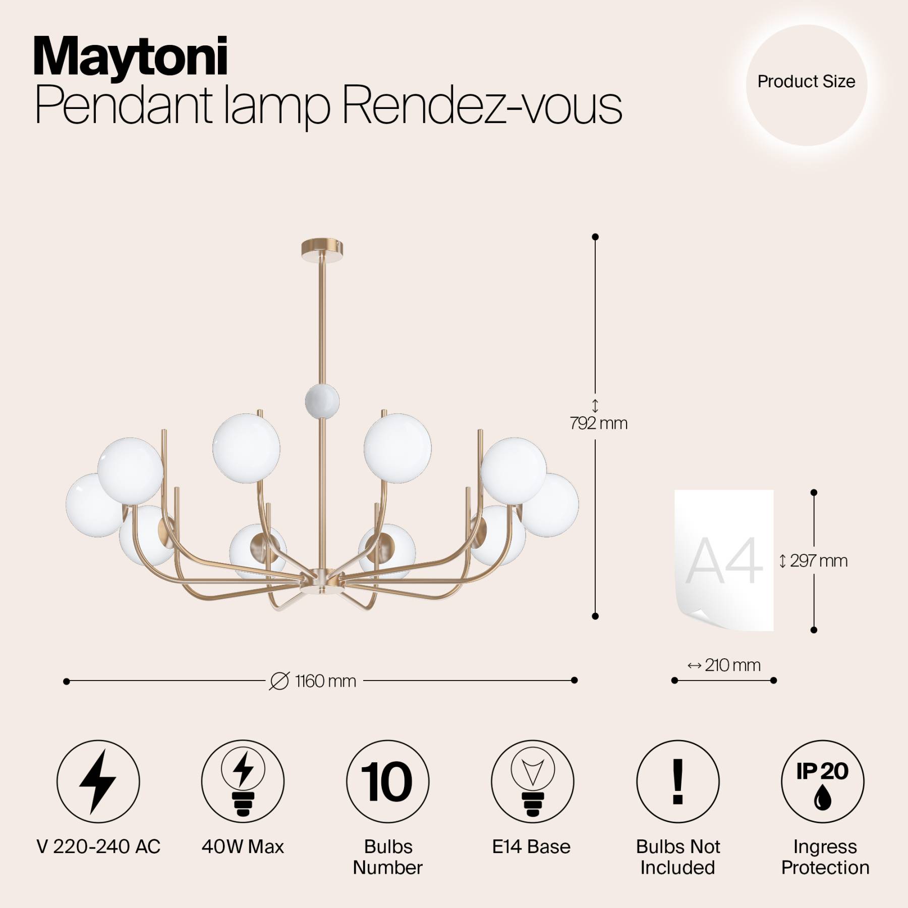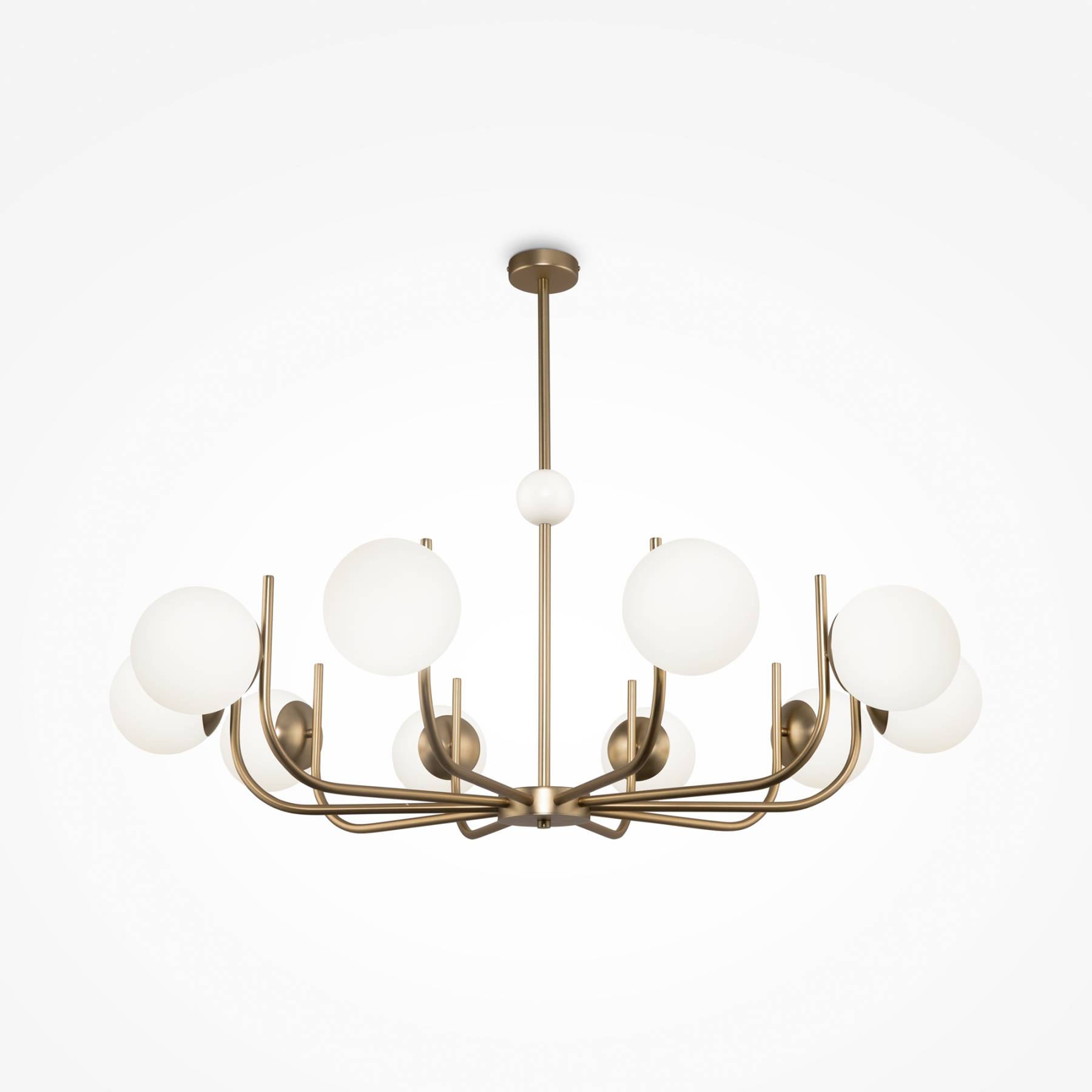 Арматура из металла окрашена в цвет латуни. Плафоны-сферы из матового белого стекла. Трендовые обтекаемые формы. Дизайн в стиле ретро. Источник света — лампы с цоколем Е14.