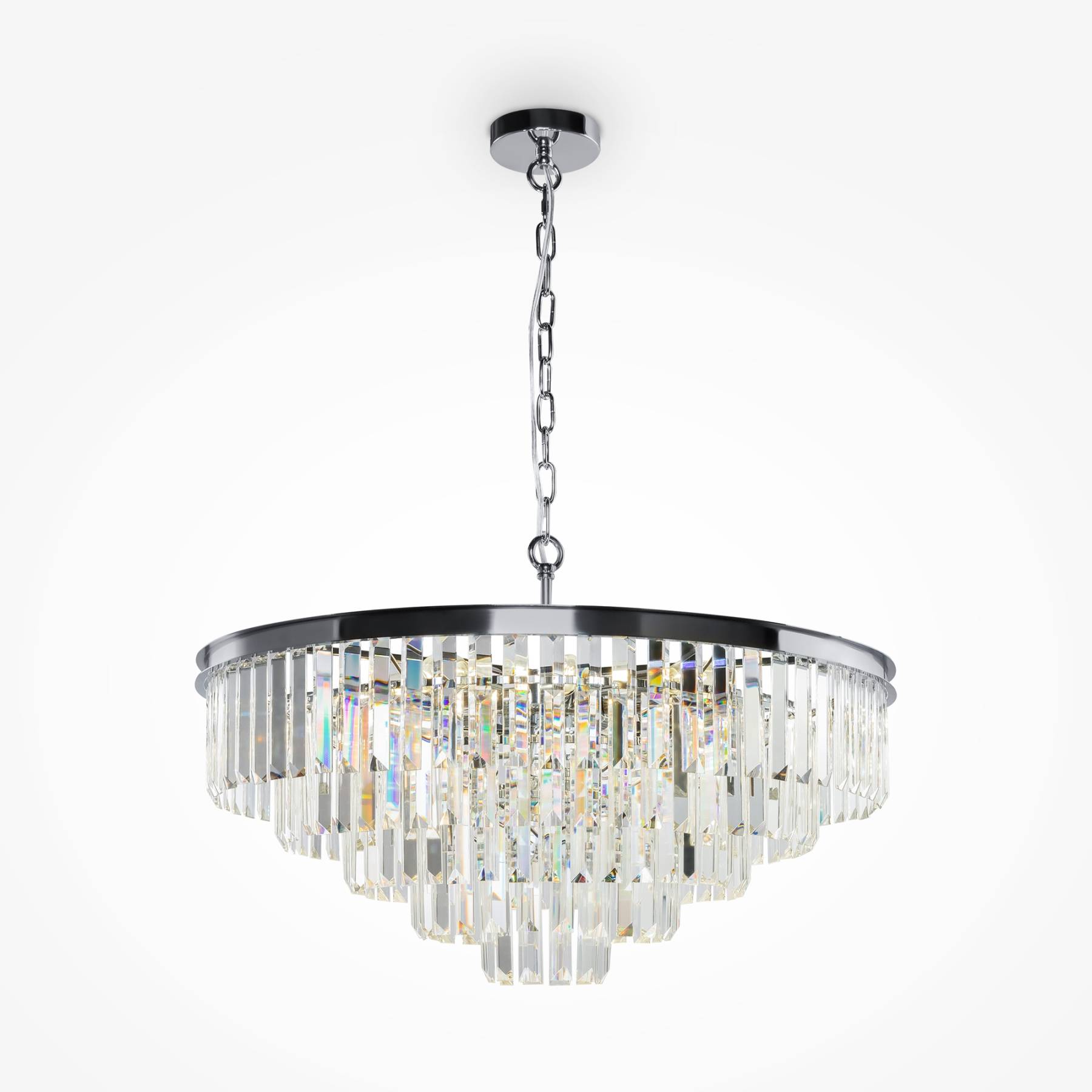 Арматура из металла в трех оттенках: латунь, хром, золото. Многоярусный декор. Подвески: прозрачное (арматура – хром, латунь) и янтарное (арматура – золото) стекло. Высота подвесных моделей регулируется.