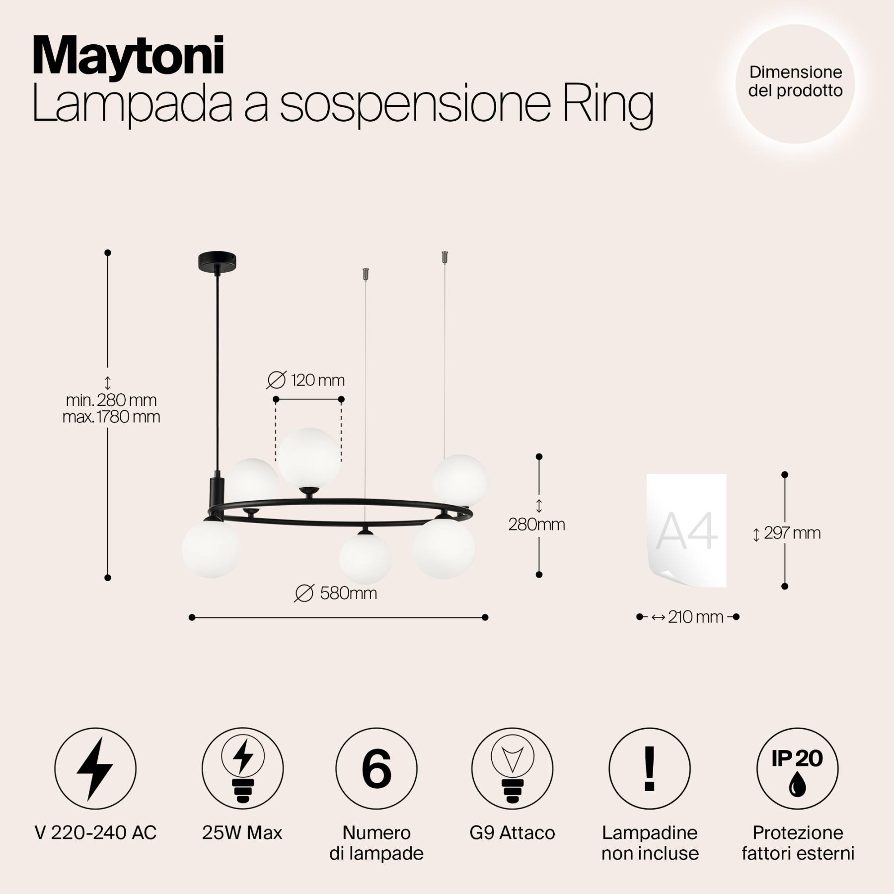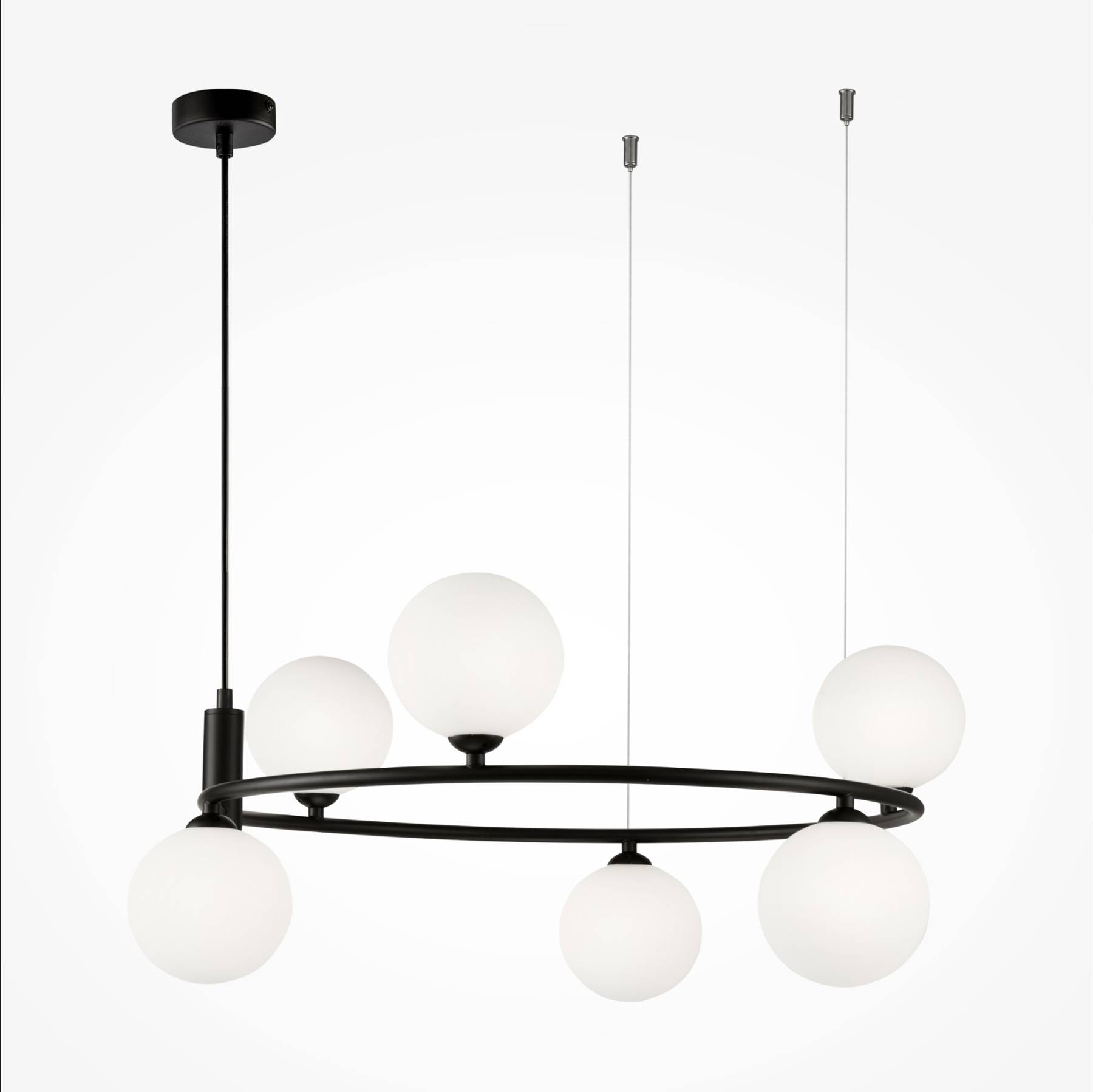 Арматура из металла в трех оттенках: белый, черный, латунь. Плафоны-сферы закреплены на округлом металлическом каркасе. Материал плафонов — выдувное стекло, цвет — белый. Высота подвесных моделей регулируется.
