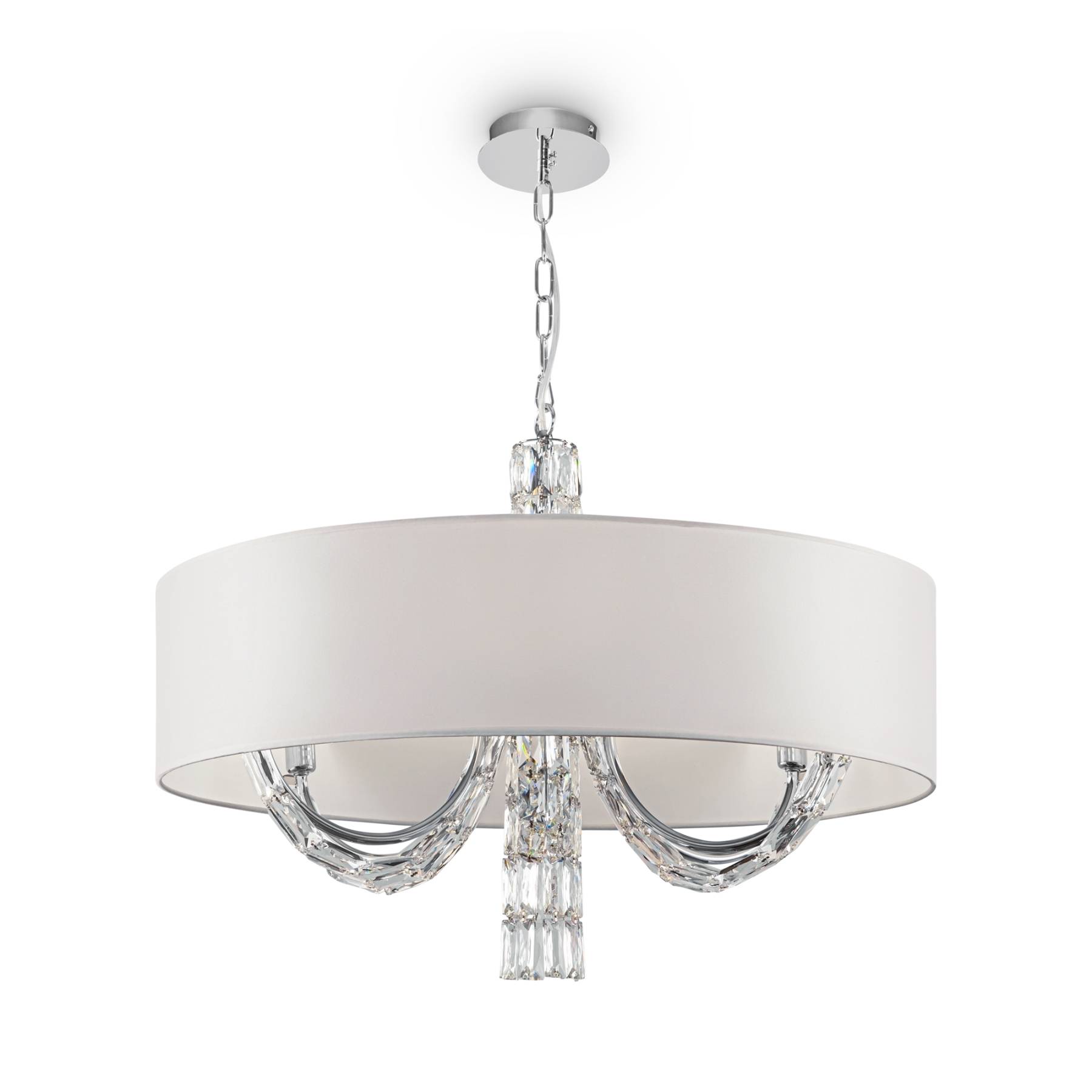 Арматура из металла, цвет – хром. Абажуры из текстиля, нанесенного на ПВХ. Цвет – белый. Декор – массивные кристаллы сложной огранки. Высота подвесных моделей регулируется.