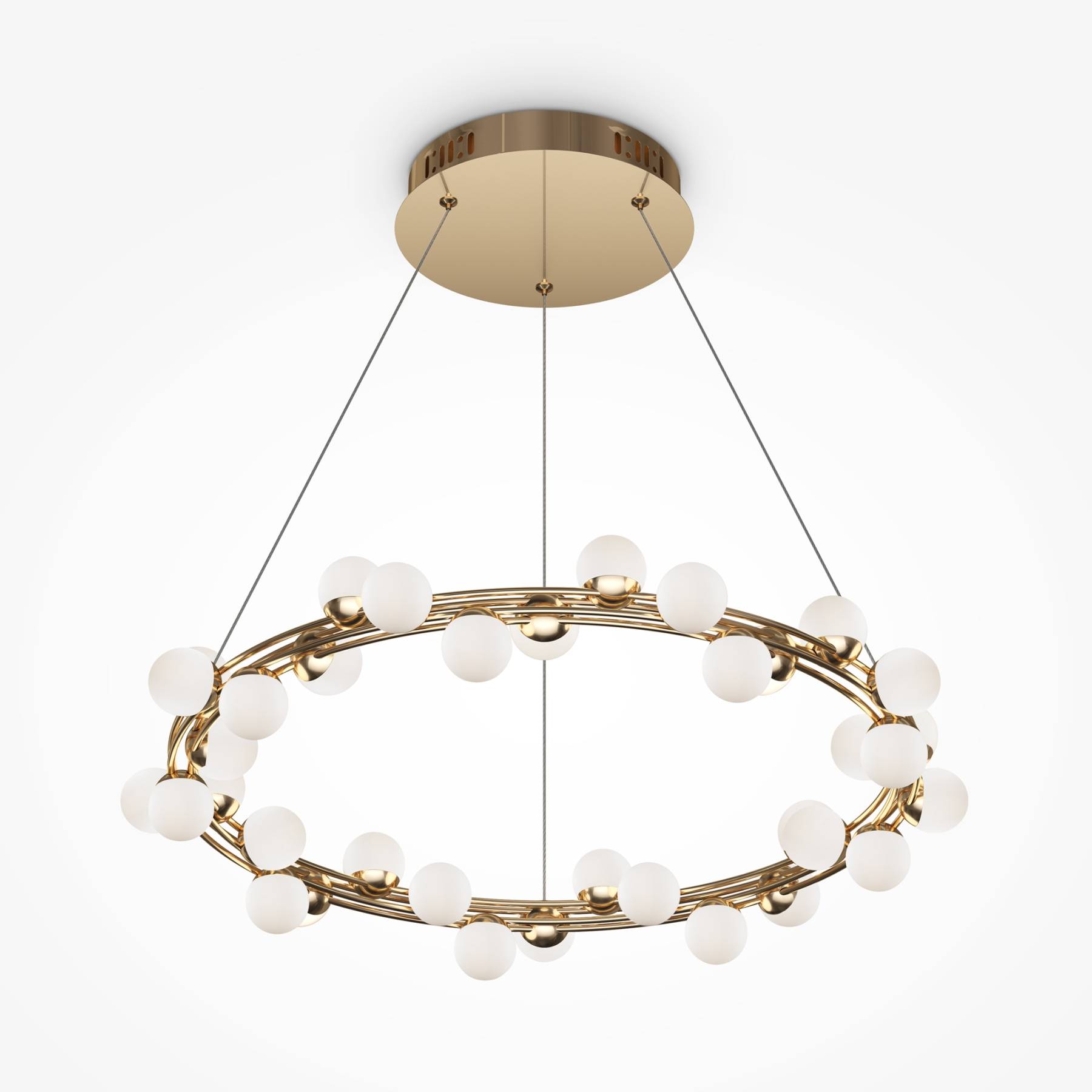 Арматура из металла в золотом цвете. Плафоны-сферы — белый пластик. Дизайн с имитацией молекулярной структуры. LED-источники света.
