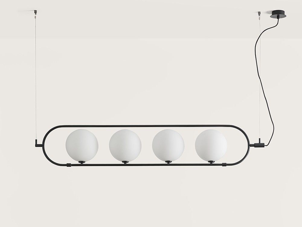 Дизайнерский светильник со стальной структурой в золотой или матовой черной отделке и четырьмя абажурами в форме шара из матового или прозрачного дутого стекла.